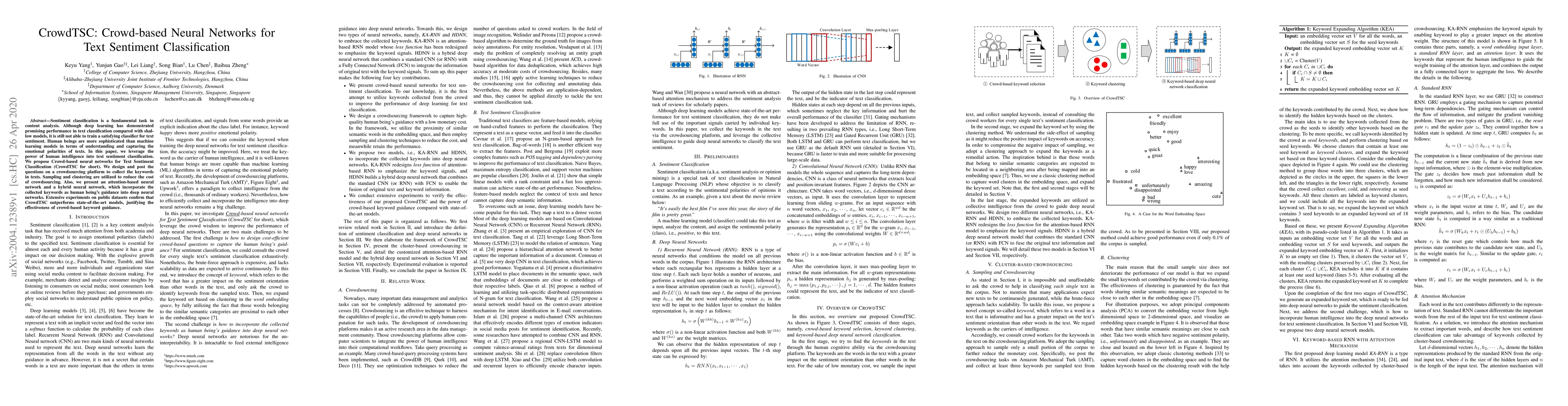This paper introduces CrowdTSC, a crowd-based neural network approach for text sentiment classification that leverages human intelligence to enhance deep learning models. By collecting keywords via crowdsourcing and integrating them into attention-based and hybrid neural networks, CrowdTSC achieves superior performance compared to state-of-the-art models.