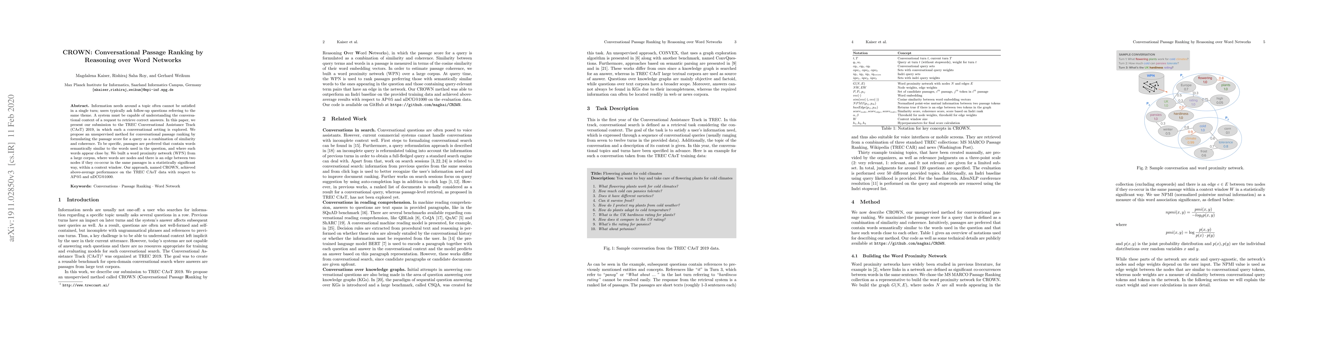 Information needs around a topic cannot be satisfied in a single turn; users typically ask follow-up questions referring to the same theme and a system must be capable of understanding the conversational context of a request to retrieve correct answers. In this paper, we present our submission to the TREC Conversational Assistance Track 2019, in which such a conversational setting is explored. We propose a simple unsupervised method for conversational passage ranking by formulating the passage score for a query as a combination of similarity and coherence. To be specific, passages are preferred that contain words semantically similar to the words used in the question, and where such words appear close by. We built a word-proximity network (WPN) from a large corpus, where words are nodes and there is an edge between two nodes if they co-occur in the same passages in a statistically significant way, within a context window. Our approach, named CROWN, improved nDCG scores over a provided Indri baseline on the CAsT training data. On the evaluation data for CAsT, our best run submission achieved above-average performance with respect to AP@5 and nDCG@1000.