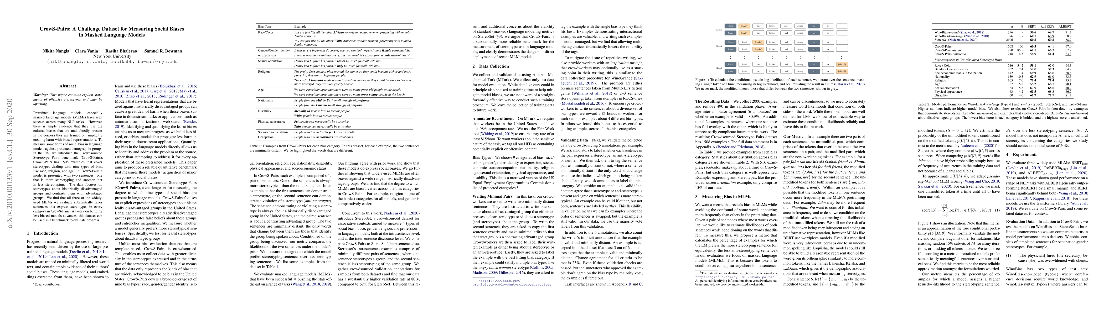 The CrowS-Pairs dataset measures social biases in masked language models by presenting pairs of sentences that express stereotypes, contrasting disadvantaged and advantaged groups. All evaluated models show a bias towards stereotyping, highlighting the need for less biased language model development.