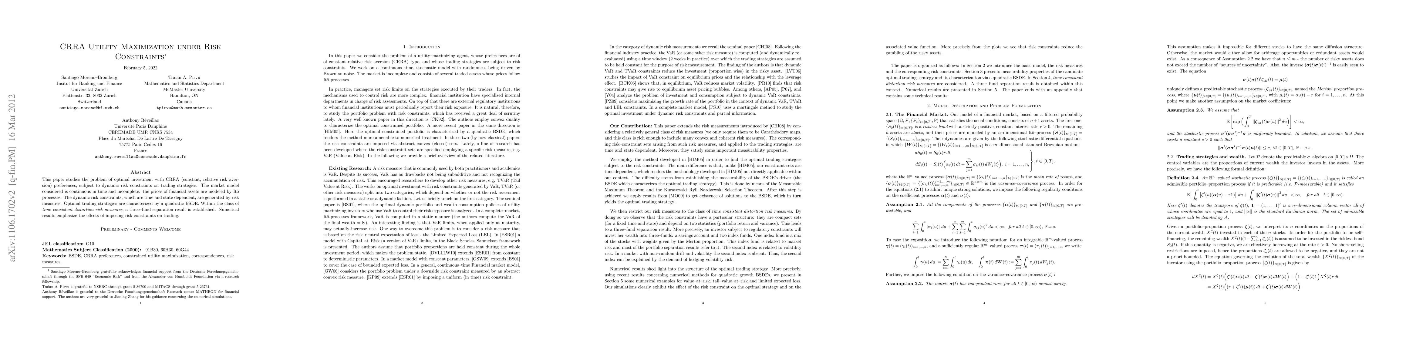 This paper studies the problem of optimal investment with CRRA (constant, relative risk aversion) preferences, subject to dynamic risk constraints on trading strategies. The market model considered is continuous in time and incomplete. the prices of financial assets are modeled by It\^o processes. The dynamic risk constraints, which are time and state dependent, are generated by risk measures. Optimal trading strategies are characterized by a quadratic BSDE. Within the class of \textit{time consistent distortion risk measures}, a three-fund separation result is established. Numerical results emphasize the effects of imposing risk constraints on trading.