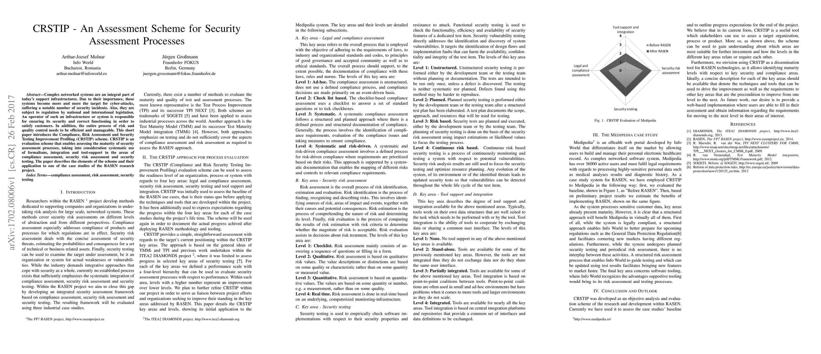 Complex networked systems are an integral part of today's support infrastructures. Due to their importance, these systems become more and more the target for cyber-attacks, suffering a notable number of security incidents. Also, they are subject to regulation by national and international legislation. An operator of such an infrastructure or system is responsible for ensuring its security and correct functioning in order to satisfy customers. In addition, the entire process of risk and quality control needs to be efficient and manageable. This short paper introduces the Compliance, Risk Assessment and Security Testing Improvement Profiling (CRSTIP) scheme. CRSTIP is an evaluation scheme that enables assessing the maturity of security assessment processes, taking into consideration systematic use of formalisms, integration and tool-support in the areas of compliance assessment, security risk assessment and security testing. The paper describes the elements of the scheme and their application to one of the case studies of the RASEN research project.