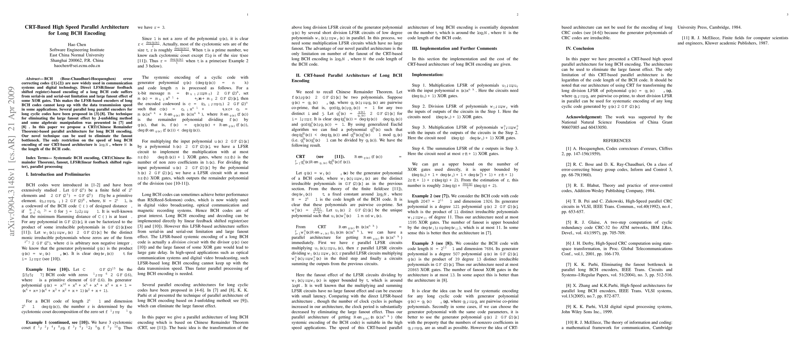 This paper proposes a CRT-based high-speed parallel architecture for long BCH encoding, addressing the limitations of serial LFSR-based methods by eliminating the fanout bottleneck and achieving encoding speeds limited only by $log_2N$, where $N$ is the code length.