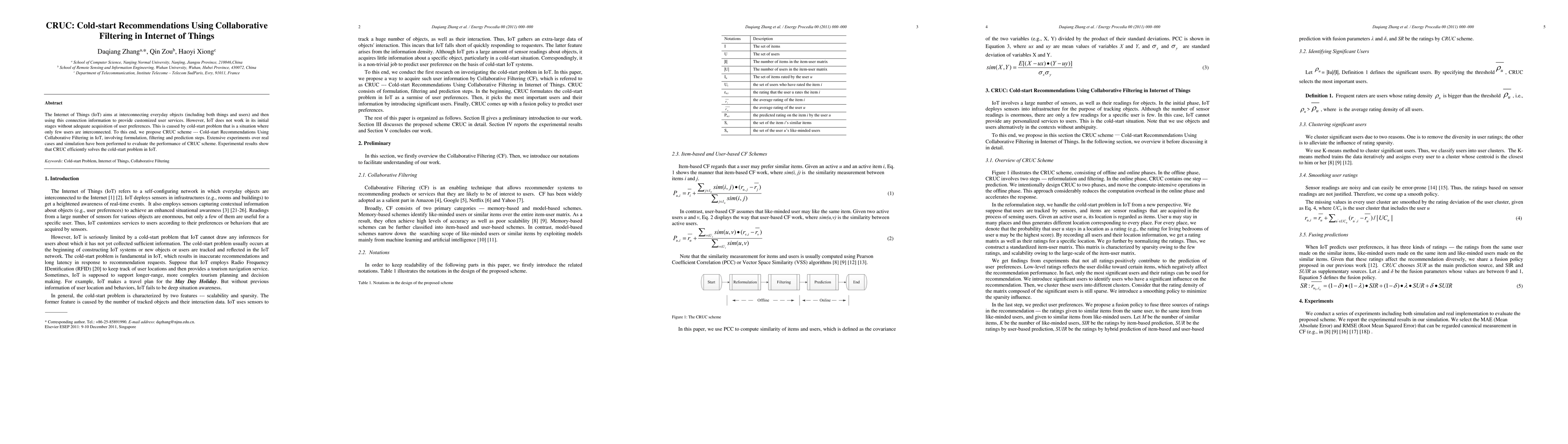 Title: CRUC: Cold-start Recommendations Using Collaborative Filtering in Internet of Things Summary: The paper proposes CRUC, a scheme for addressing the cold-start problem in IoT by using collaborative filtering for recommendation, involving formulation, filtering, and prediction steps. Experimental results demonstrate CRUC's effectiveness in providing customized services despite initial limited user data.