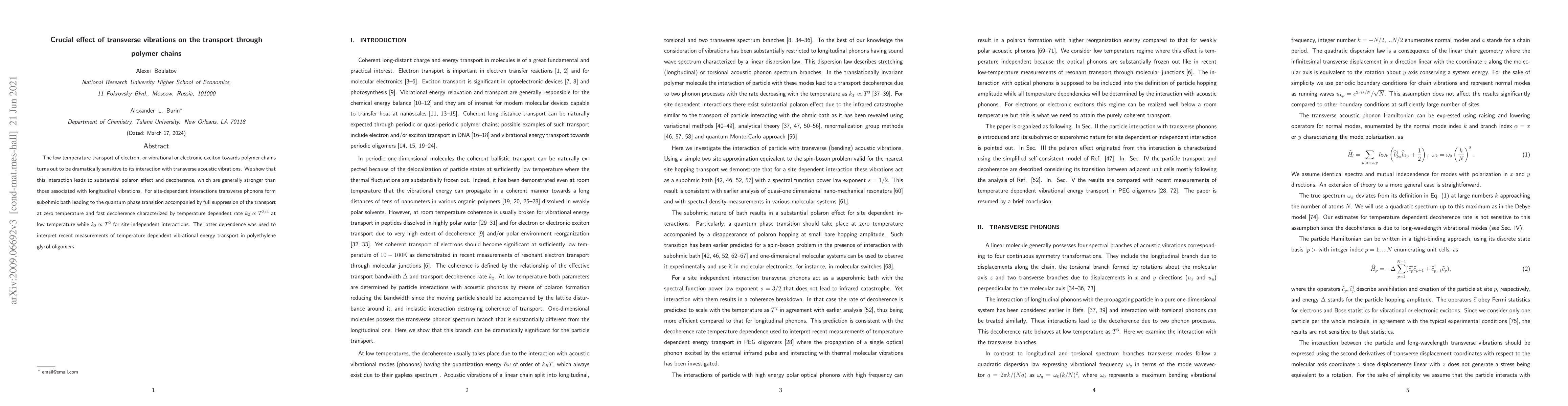 The low temperature transport of electron, or vibrational or electronic exciton towards polymer chains turns out to be dramatically sensitive to its interaction with transverse acoustic vibrations. We show that this interaction leads to substantial polaron effect and decoherence, which are generally stronger than those associated with longitudinal vibrations. For site-dependent interactions transverse phonons form subohmic bath leading to the quantum phase transition accompanied by full suppression of the transport at zero temperature and fast decoherence characterized by temperature dependent rate of temperature to the power of two thirds at low temperature while this rate rate ois proportional to the squared temperature for site-independent interactions. The latter dependence was used to interpret recent measurements of temperature dependent vibrational energy transport in polyethylene glycol oligomers.