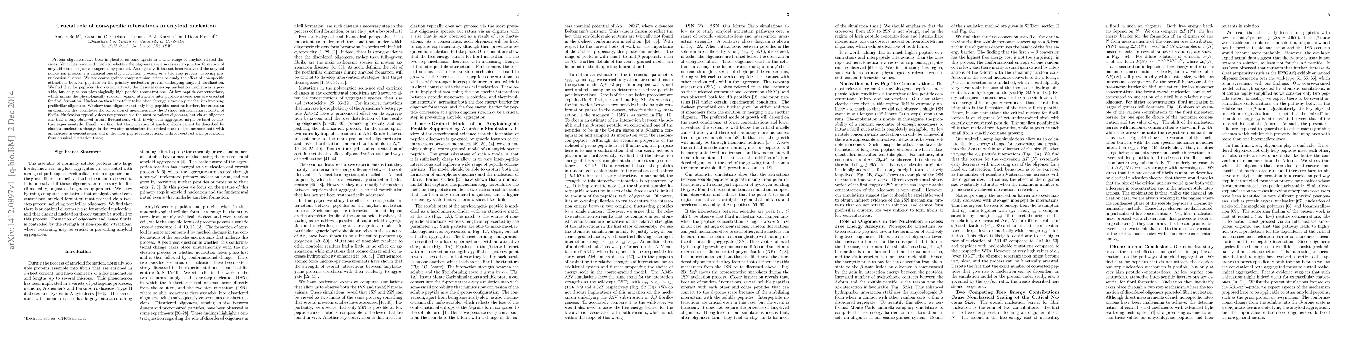 This study reveals that non-specific interactions between peptides are crucial for amyloid nucleation, especially at physiologically relevant concentrations. It demonstrates that nucleation occurs via a two-step process involving prefibrillar oligomers, rather than a classical one-step mechanism, challenging classical nucleation theory predictions.
