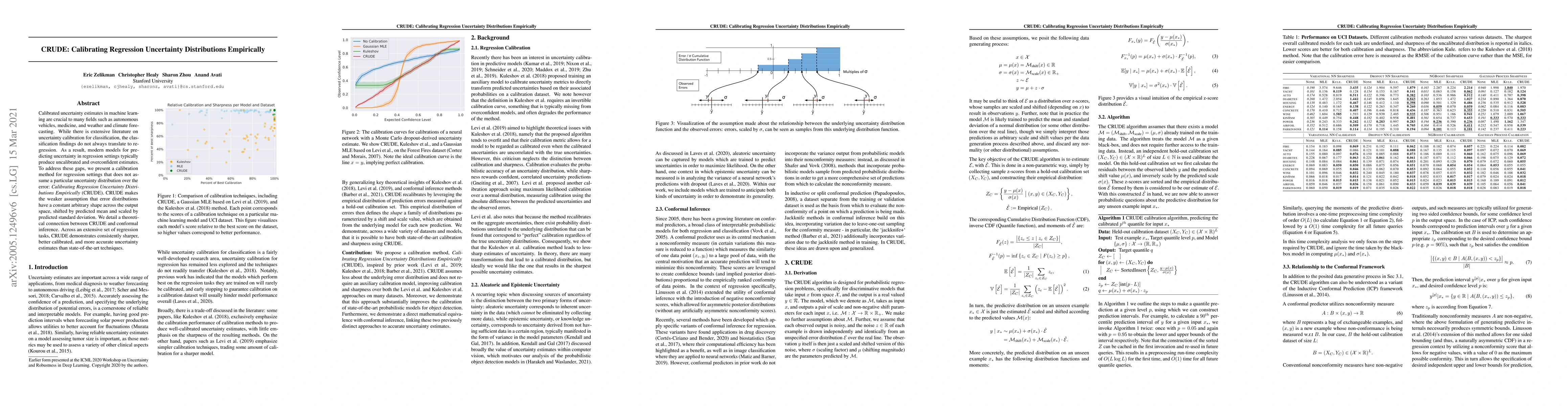 Calibrated uncertainty estimates in machine learning are crucial to many fields such as autonomous vehicles, medicine, and weather and climate forecasting. While there is extensive literature on uncertainty calibration for classification, the classification findings do not always translate to regression. As a result, modern models for predicting uncertainty in regression settings typically produce uncalibrated and overconfident estimates. To address these gaps, we present a calibration method for regression settings that does not assume a particular uncertainty distribution over the error: Calibrating Regression Uncertainty Distributions Empirically (CRUDE). CRUDE makes the weaker assumption that error distributions have a constant arbitrary shape across the output space, shifted by predicted mean and scaled by predicted standard deviation. We detail a theoretical connection between CRUDE and conformal inference. Across an extensive set of regression tasks, CRUDE demonstrates consistently sharper, better calibrated, and more accurate uncertainty estimates than state-of-the-art techniques.