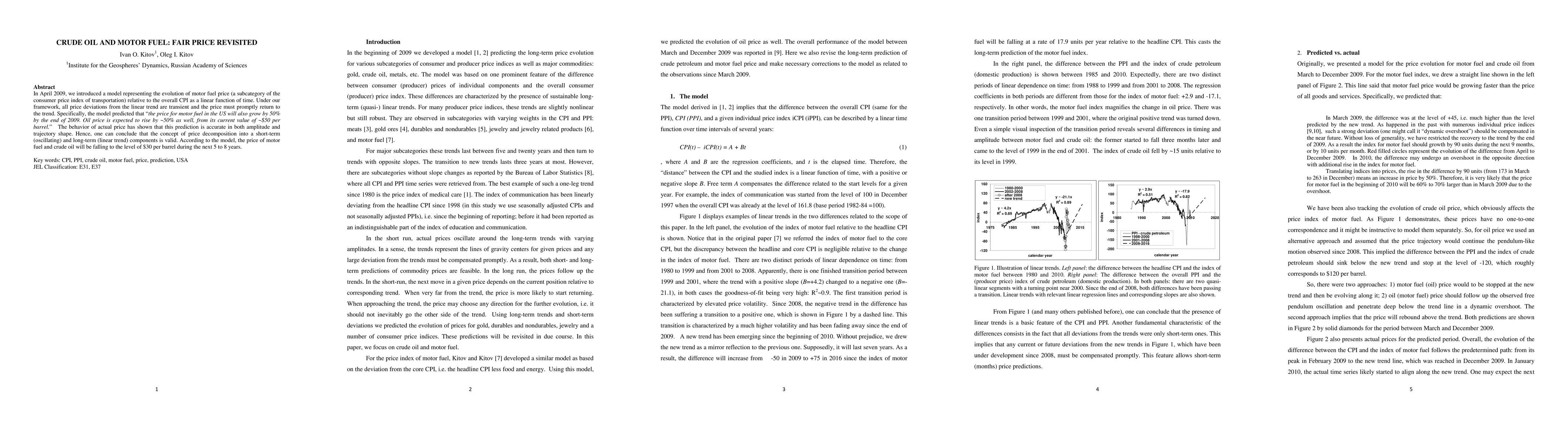 In April 2009, we introduced a model representing the evolution of motor fuel price (a subcategory of the consumer price index of transportation) relative to the overall CPI as a linear function of time. Under our framework, all price deviations from the linear trend are transient and the price must promptly return to the trend. Specifically, the model predicted that "the price for motor fuel in the US will also grow by 50% by the end of 2009. Oil price is expected to rise by ~50% as well, from its current value of ~$50 per barrel". The behavior of actual price has shown that this prediction is accurate in both amplitude and trajectory shape. Hence, one can conclude that the concept of price decomposition into a short-term (oscillating) and long-term (linear trend) components is valid. According to the model, the price of motor fuel and crude oil will be falling to the level of $30 per barrel during the next 5 to 8 years.