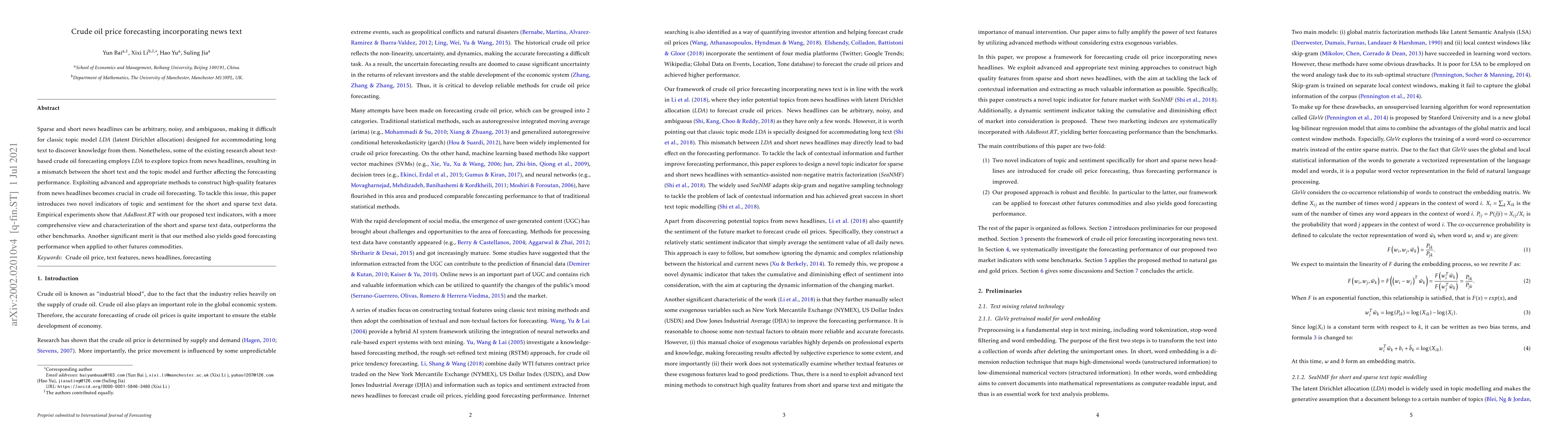 This paper proposes novel indicators of topic and sentiment for short and sparse news headlines to improve crude oil price forecasting. The method, AdaBoost.RT with the new text indicators, outperforms existing benchmarks and also shows good performance for other futures commodities.