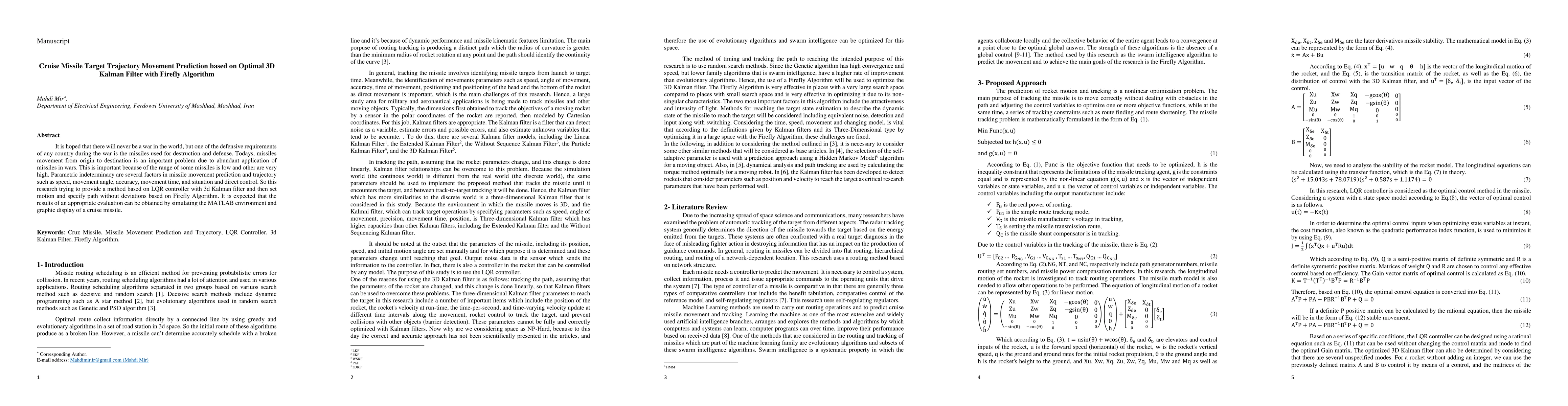 It is hoped that there will never be a war in the world, but one of the defensive requirements of any country during the war is the missiles used for destruction and defense. Todays, missiles movement from origin to destination is an important problem due to abundant application of missiles in wars. This is important because of the range of some missiles is low and other are very high. Parametric indeterminacy are several factors in missile movement prediction and trajectory such as speed, movement angle, accuracy, movement time, and situation and direct control. So this research trying to provide a method based on LQR controller with 3d Kalman filter and then set motion and specify path without deviations based on Firefly Algorithm. It is expected that the results of an appropriate evaluation can be obtained by simulating the MATLAB environment and graphic display of a cruise missile.
