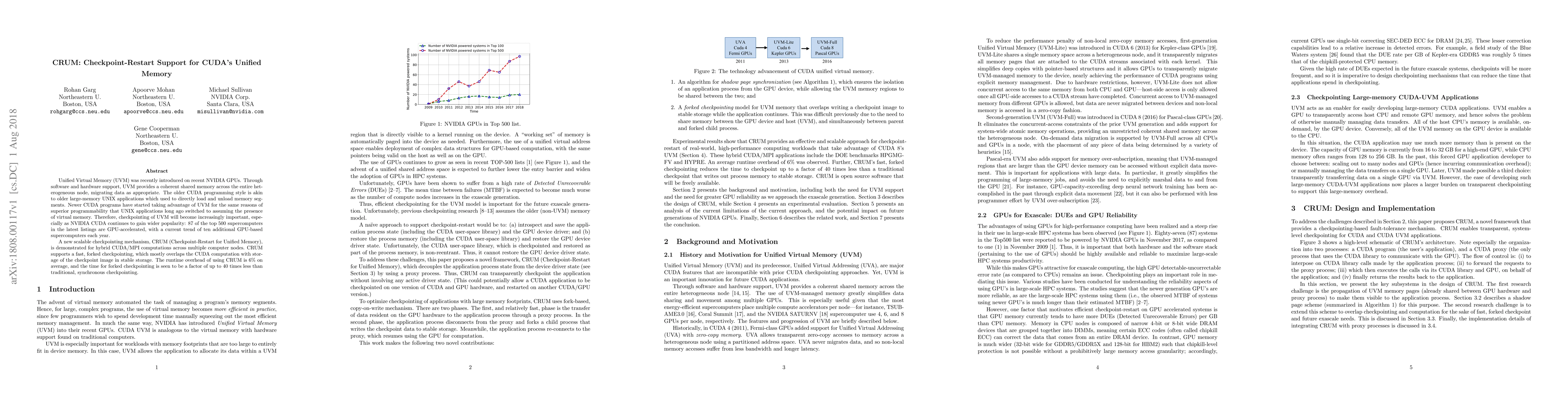 The paper introduces CRUM, a scalable checkpointing mechanism for CUDA's Unified Virtual Memory (UVM), which allows for fast, forked checkpointing that overlaps with CUDA computation, reducing overhead by 6% on average and significantly speeding up the checkpointing process compared to traditional methods.