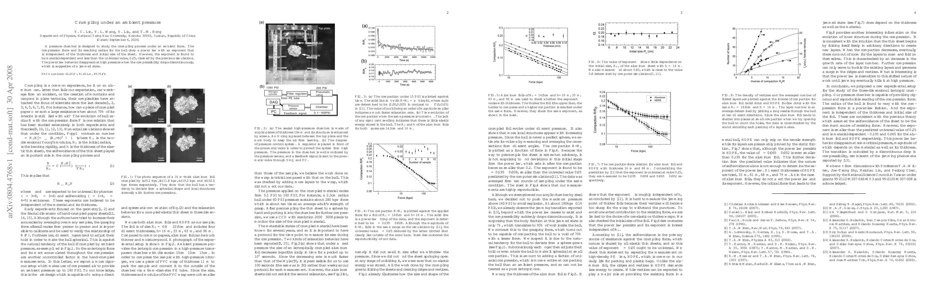 A pressure chamber is designed to study the crumpling process under an ambient force. The compression force and its resulting radius for the ball obey a power law with an exponent that is independent of the thickness and initial size of the sheet. However, the exponent is found to be material-dependent and less than the universal value, 0.25, claimed by the previous simulations. The power law behavior disappears at high pressure when the compressibility drops discontinuously, which is suggestive of a jammed state.