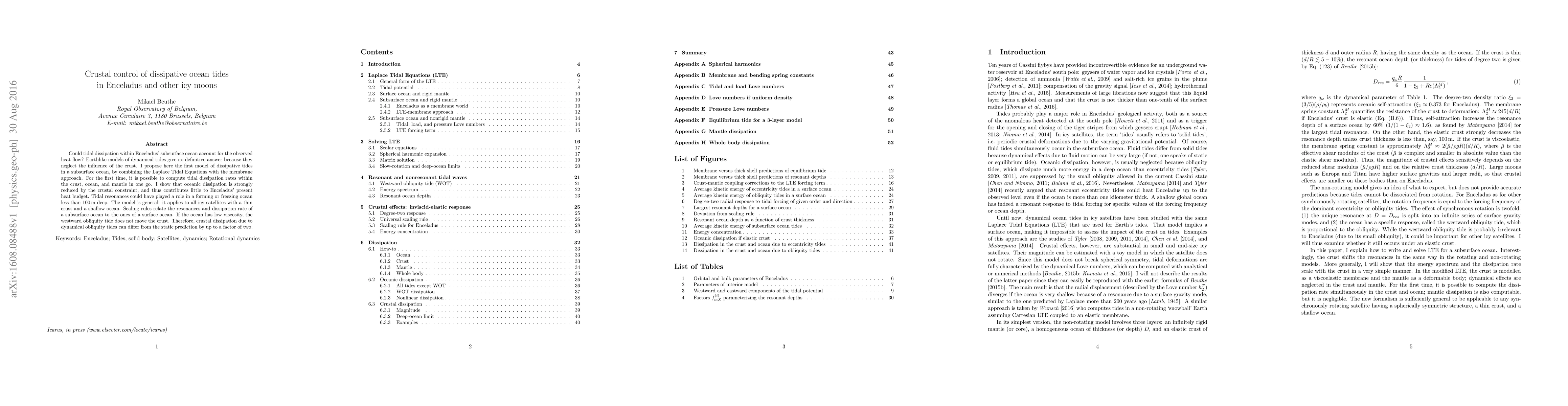 This paper proposes a new model combining Laplace Tidal Equations and the membrane approach to study tidal dissipation in Enceladus' subsurface ocean, showing that crustal constraints significantly reduce oceanic dissipation, thus contributing little to the current heat flow. The model is applicable to other icy moons and suggests that tidal resonances may have influenced the formation or freezing of a shallow ocean.
