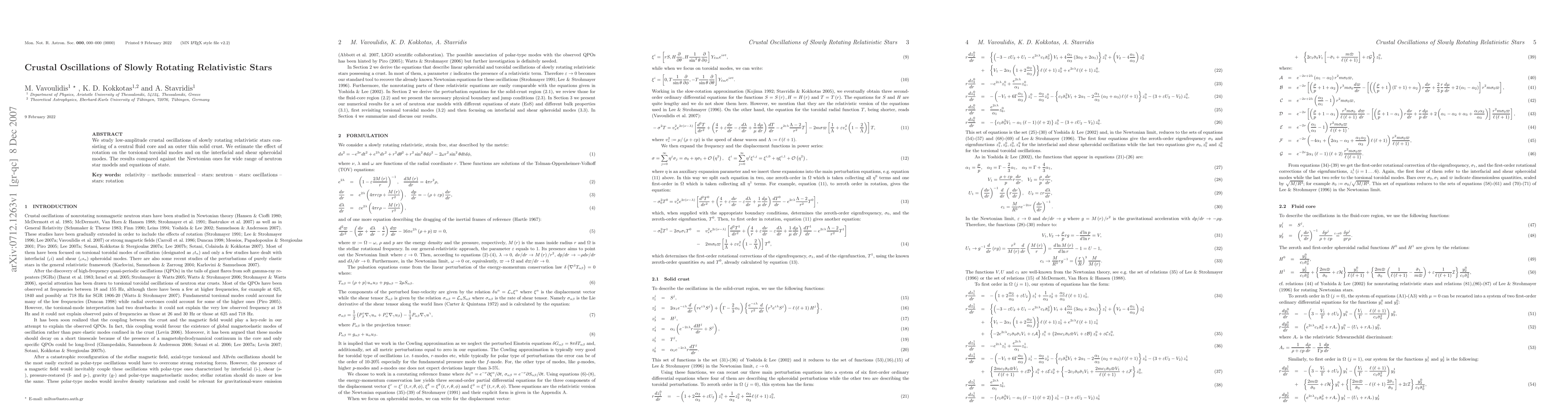 This paper investigates the low-amplitude crustal oscillations in slowly rotating relativistic stars, focusing on torsional toroidal and interfacial/shear spheroidal modes, and compares the relativistic effects with Newtonian models across various neutron star equations of state.