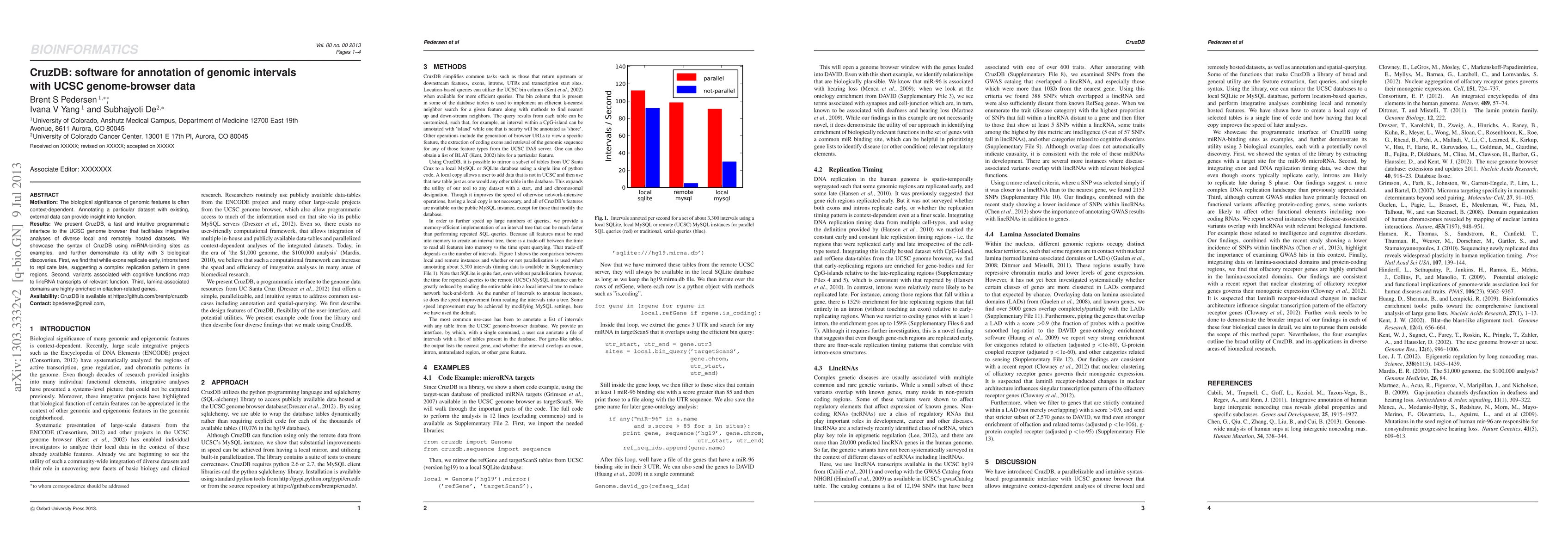 CruzDB is a software tool that provides a programmatic interface to the UCSC genome browser, enabling integrative analyses of genomic datasets. It facilitates the annotation of genomic intervals with UCSC data and demonstrates utility through novel biological discoveries, such as complex replication patterns in gene regions and enrichment of lamina-associated domains in olfaction-related genes.