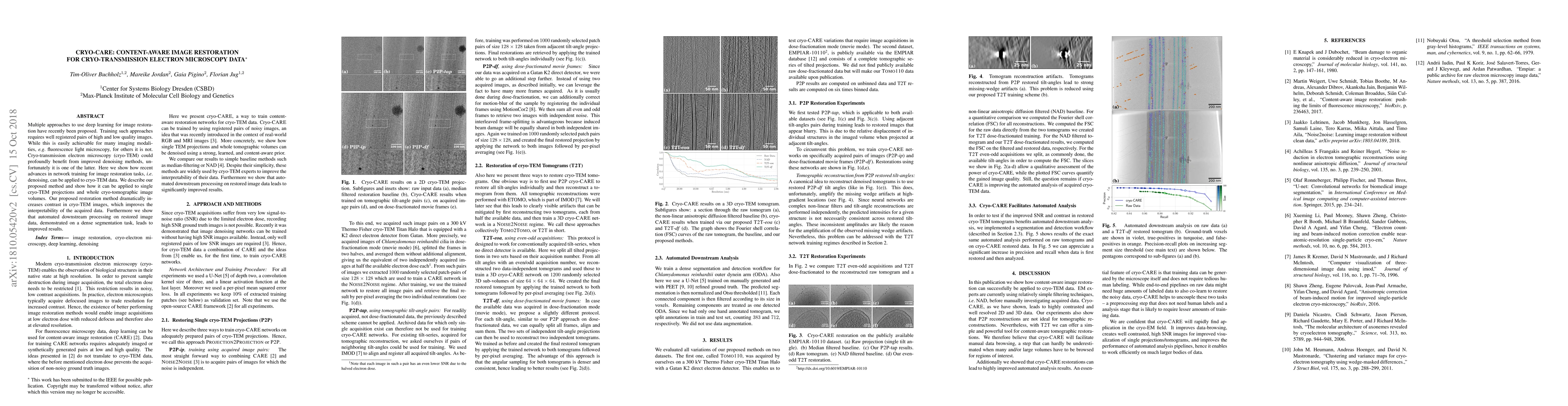 Cryo-CARE employs deep learning for content-aware restoration of cryo-transmission electron microscopy (cryo-TEM) data, significantly enhancing image contrast and interpretability. The method also improves the outcomes of automated downstream processing tasks, such as dense segmentation.