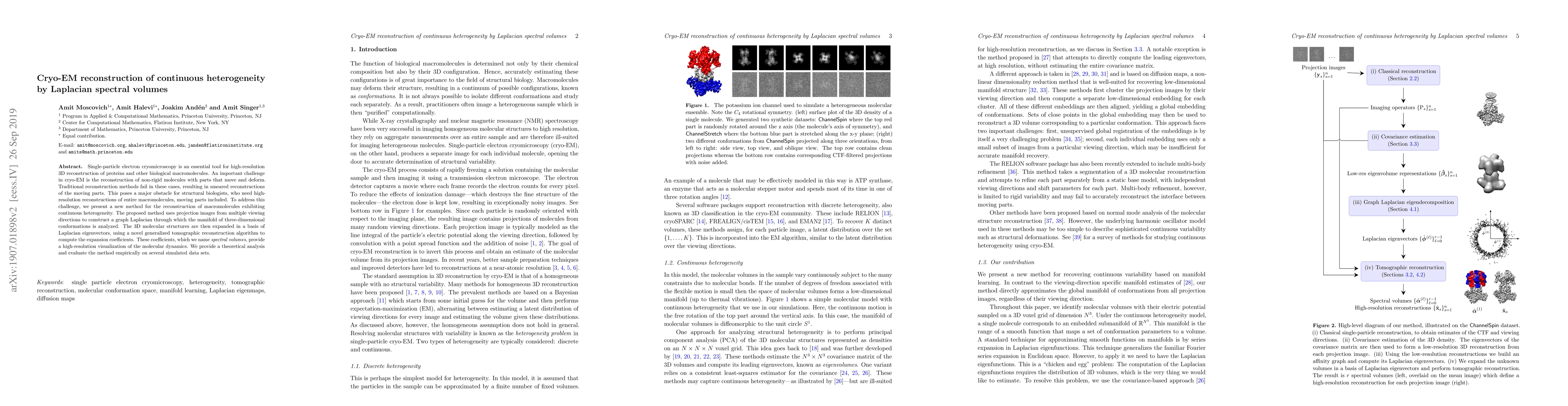 The paper presents a new method for high-resolution 3D reconstruction of non-rigid biological macromolecules using cryo-EM. It combines spectral graph theory with covariance-based low-resolution reconstruction, computing conformation-dependent Laplacian eigenmap coordinates and generating spectral volumes that characterize molecular variability.