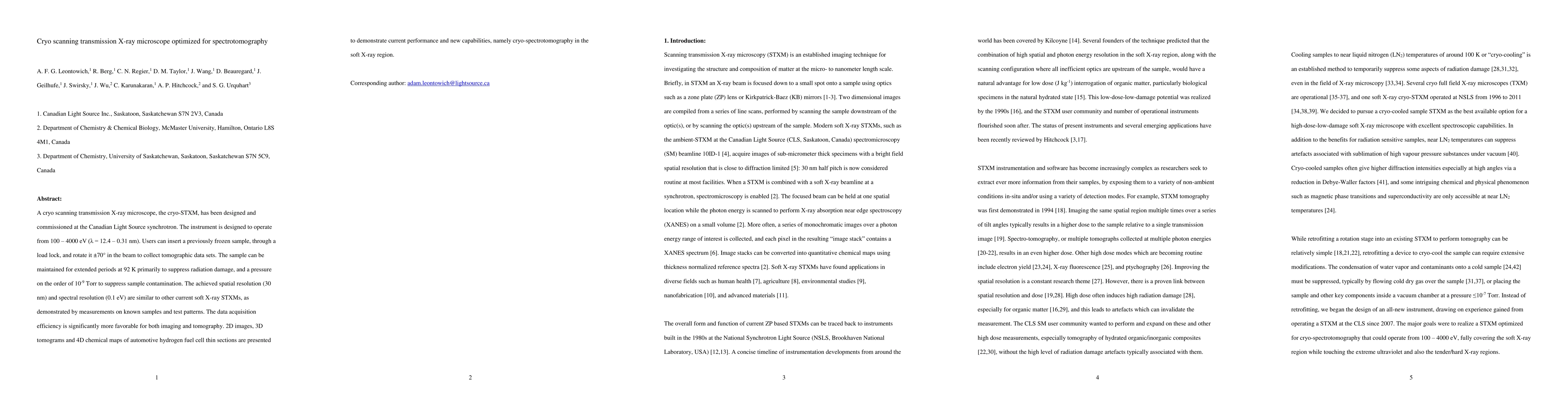 A cryo scanning transmission X-ray microscope has been developed to perform spectrotomography with high spatial and spectral resolution, enabling 2D imaging, 3D tomograms, and 4D chemical maps of frozen samples.