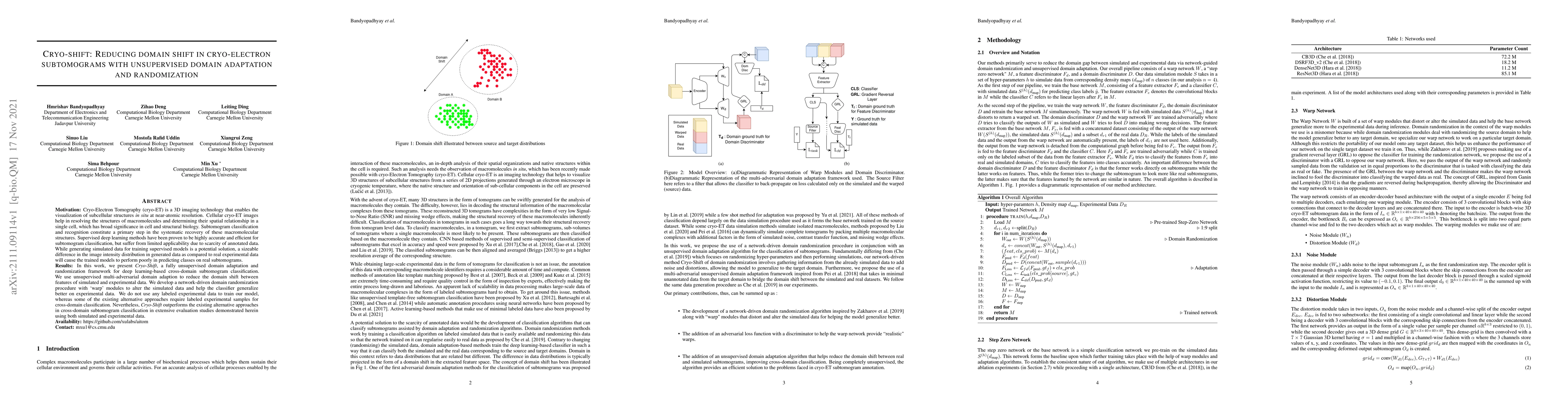 Cryo-Shift presents an unsupervised domain adaptation and randomization framework to tackle the domain shift issue in cryo-electron subtomogram classification, enabling effective cross-domain predictions without requiring labeled experimental data. The method outperforms existing approaches by leveraging unsupervised multi-adversarial domain adaptation and network-driven domain randomization.