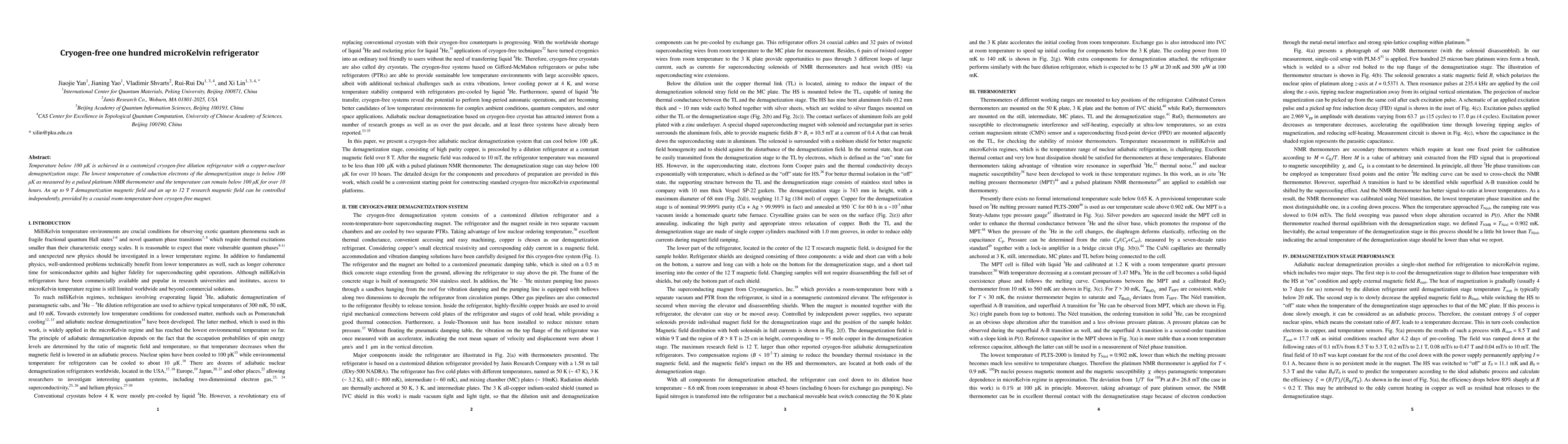 This paper describes a cryogen-free dilution refrigerator that achieves temperatures below 100 microKelvin using a copper-nuclear demagnetization stage, maintaining such low temperatures for over 10 hours and enabling independent control of up to 9 T demagnetization and 12 T research magnetic fields.