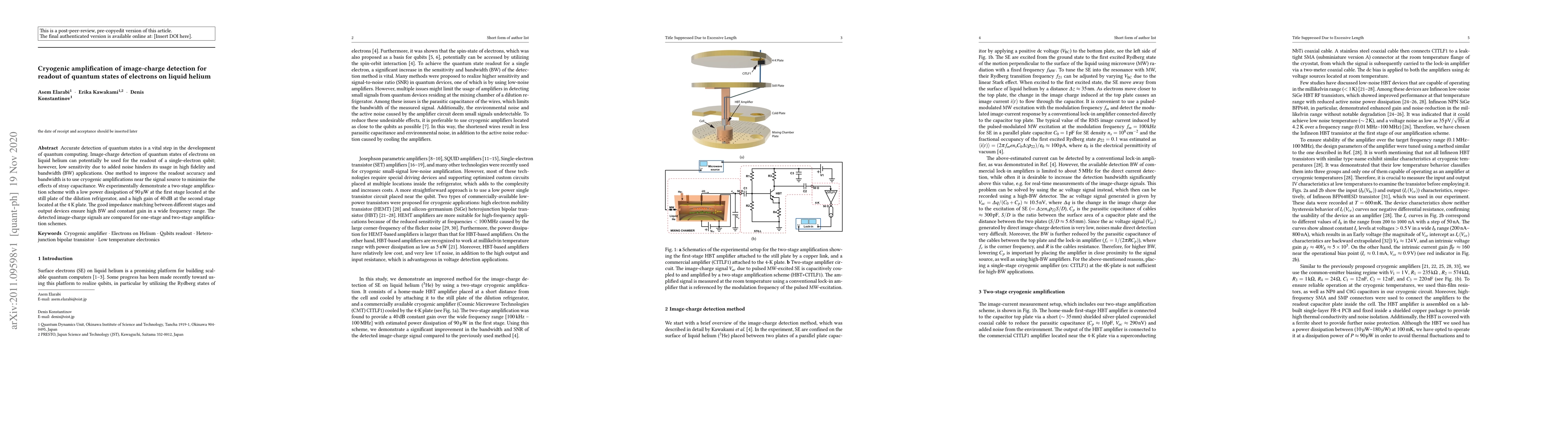 Accurate detection of quantum states is a vital step in the development of quantum computing. Image-charge detection of quantum states of electrons on liquid helium can potentially be used for the readout of a single-electron qubit; however, low sensitivity due to added noise hinders its usage in high fidelity and bandwidth (BW) applications. One method to improve the readout accuracy and bandwidth is to use cryogenic amplifications near the signal source to minimize the effects of stray capacitance. We experimentally demonstrate a two-stage amplification scheme with a low power dissipation of 90 {\mu}W at the first stage located at the still plate of the dilution refrigerator and a high gain of 40 dB at the second stage located at the 4 K plate. The good impedance matching between different stages and output devices ensure high BW and constant gain in a wide frequency range. The detected image-charge signals are compared for one-stage and two-stage amplification schemes.