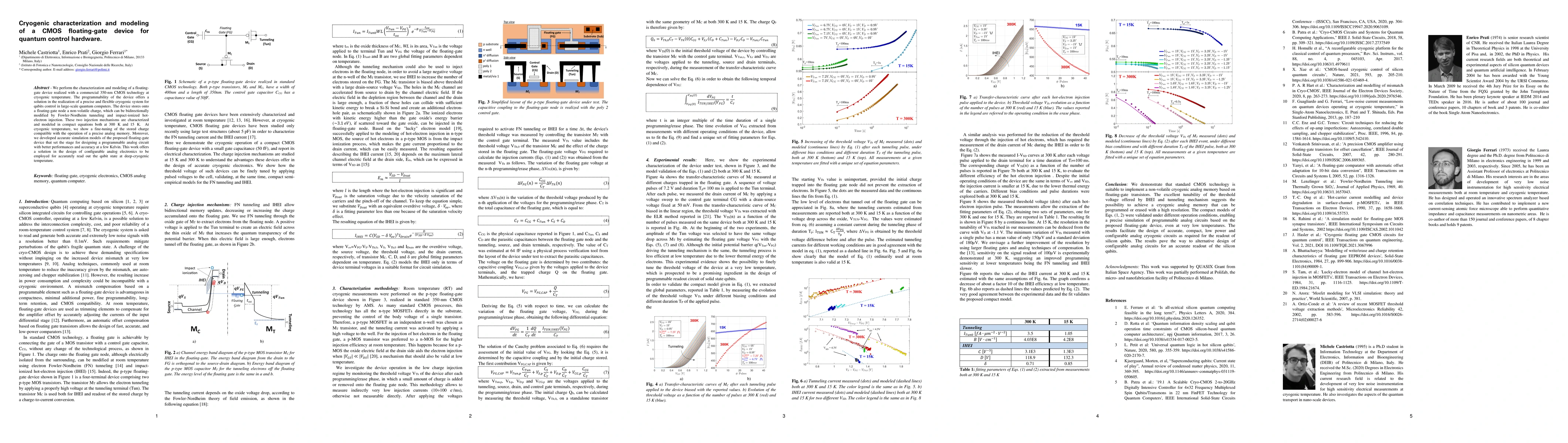 This paper characterizes and models a CMOS floating-gate device for cryogenic quantum control hardware, demonstrating its programmability and precise charge storage at low temperatures. The study provides compact equations for charge injection mechanisms at both room and cryogenic temperatures, enabling the design of configurable analog electronics for qubit state readout.