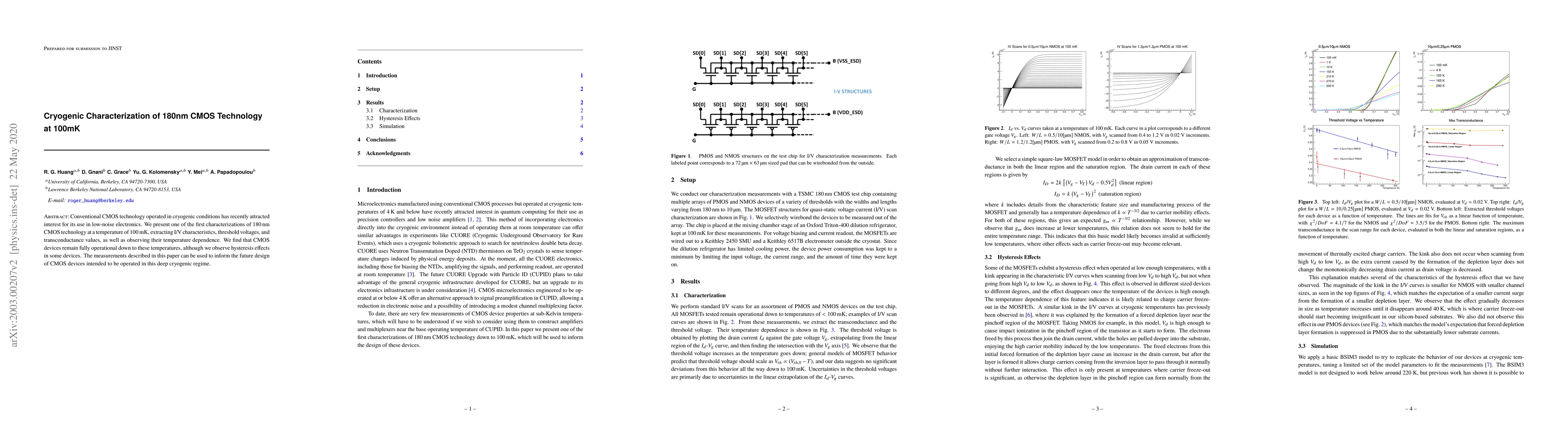 This paper characterizes 180 nm CMOS technology at 100 mK, finding it remains operational with extracted I/V characteristics, threshold voltages, and transconductance values, though some devices exhibit hysteresis effects. The results inform future designs for cryogenic CMOS applications.