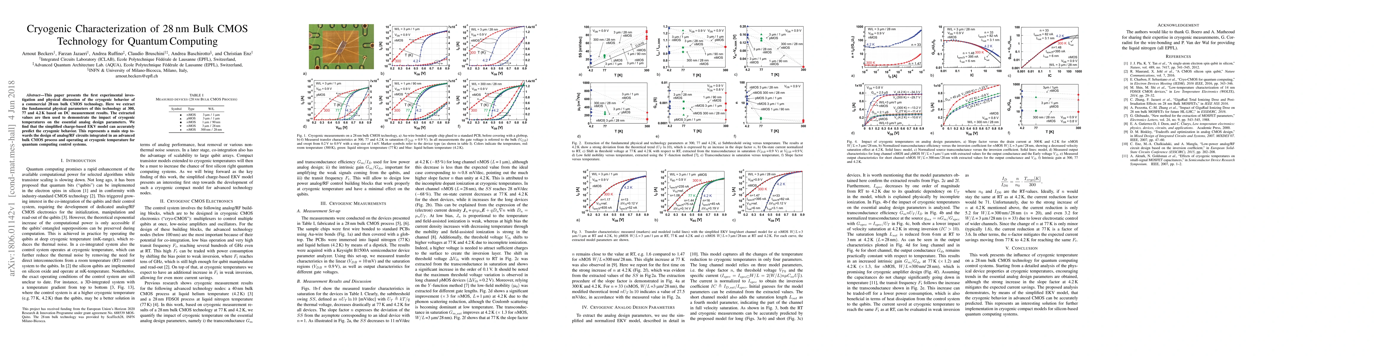 This paper investigates the cryogenic behavior of 28 nm bulk CMOS technology, extracting key parameters at 300, 77, and 4.2 K. The study finds that the EKV model can accurately predict performance, paving the way for advanced analog/RF circuits in quantum computing control systems.