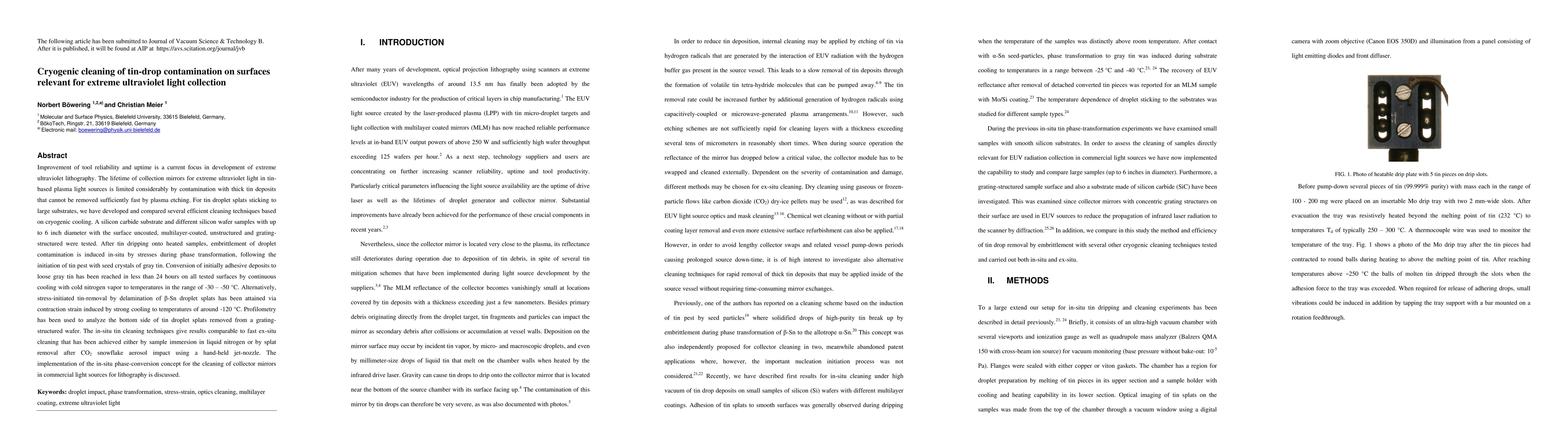 This paper explores cryogenic cleaning techniques to remove tin droplet contamination from surfaces used in extreme ultraviolet light collection. Efficient methods involve cooling substrates to temperatures between -30 to -50 °C or -120 °C to induce phase transformation or delamination of tin deposits, achieving comparable results to ex-situ cleaning methods.