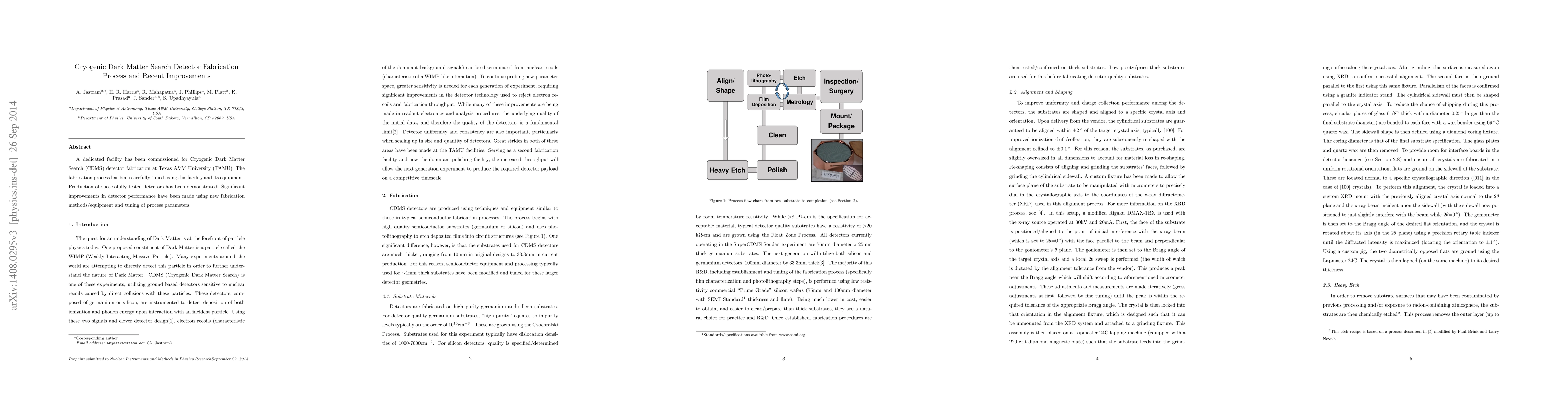 Summary: Texas A&M University has established a dedicated facility for fabricating Cryogenic Dark Matter Search (CDMS) detectors, optimizing the fabrication process and achieving successful production of tested detectors. Recent enhancements in detector performance are attributed to new fabrication methods and refined process parameters.