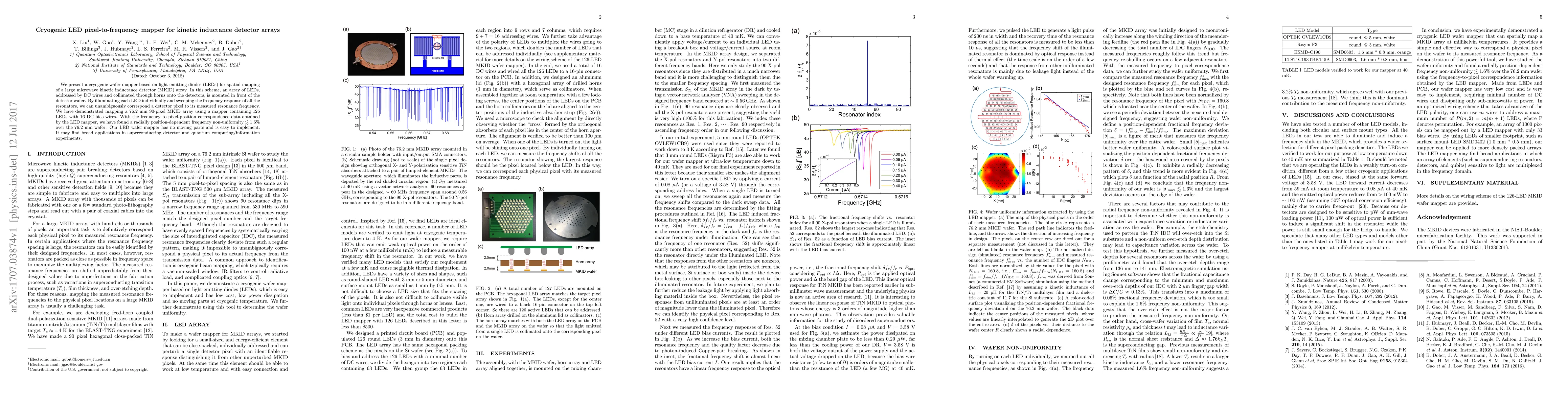 This paper introduces a cryogenic LED wafer mapper for mapping large microwave kinetic inductance detector arrays, achieving a frequency non-uniformity of <1.6% over a 76.2 mm wafer. The mapper uses LEDs to individually illuminate detector pixels, providing a precise frequency-to-pixel correspondence without moving parts.