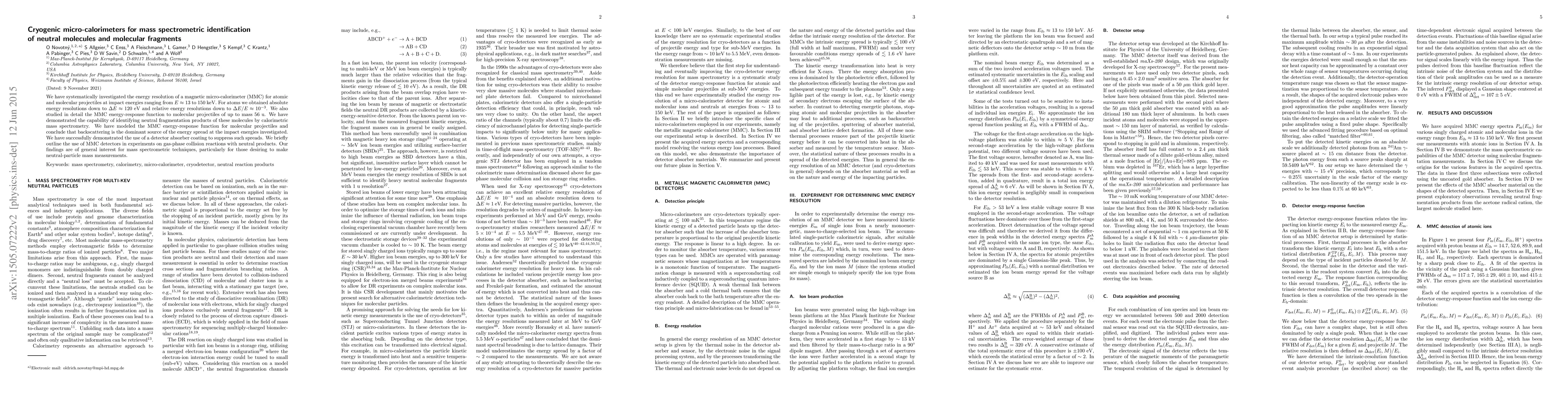 This paper investigates the energy resolution of cryogenic micro-calorimeters for identifying neutral molecules and fragments, achieving high resolutions for atomic and molecular projectiles. The study demonstrates the ability to detect neutral fragmentation products using calorimetric mass spectrometry and proposes methods to minimize energy spread.