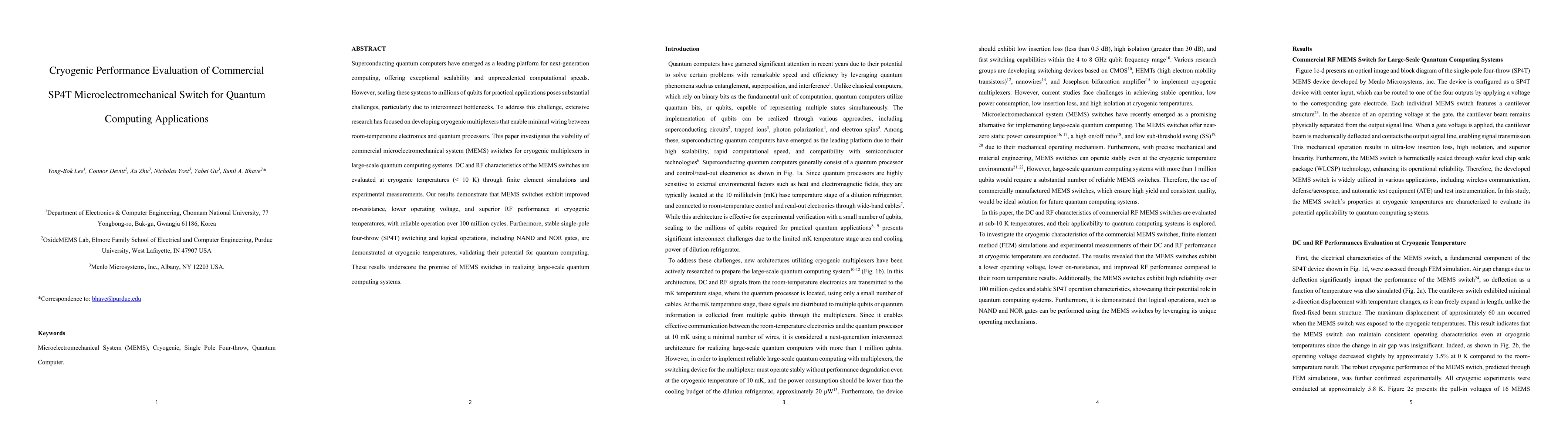 Superconducting quantum computers have emerged as a leading platform for next-generation computing, offering exceptional scalability and unprecedented computational speeds. However, scaling these systems to millions of qubits for practical applications poses substantial challenges, particularly due to interconnect bottlenecks. To address this challenge, extensive research has focused on developing cryogenic multiplexers that enable minimal wiring between room-temperature electronics and quantum processors. This paper investigates the viability of commercial microelectromechanical system (MEMS) switches for cryogenic multiplexers in large-scale quantum computing systems. DC and RF characteristics of the MEMS switches are evaluated at cryogenic temperatures (< 10 K) through finite element simulations and experimental measurements. Our results demonstrate that MEMS switches exhibit improved on-resistance, lower operating voltage, and superior RF performance at cryogenic temperatures, with reliable operation over 100 million cycles. Furthermore, stable single-pole four-throw (SP4T) switching and logical operations, including NAND and NOR gates, are demonstrated at cryogenic temperatures, validating their potential for quantum computing. These results underscore the promise of MEMS switches in realizing large-scale quantum computing systems.
