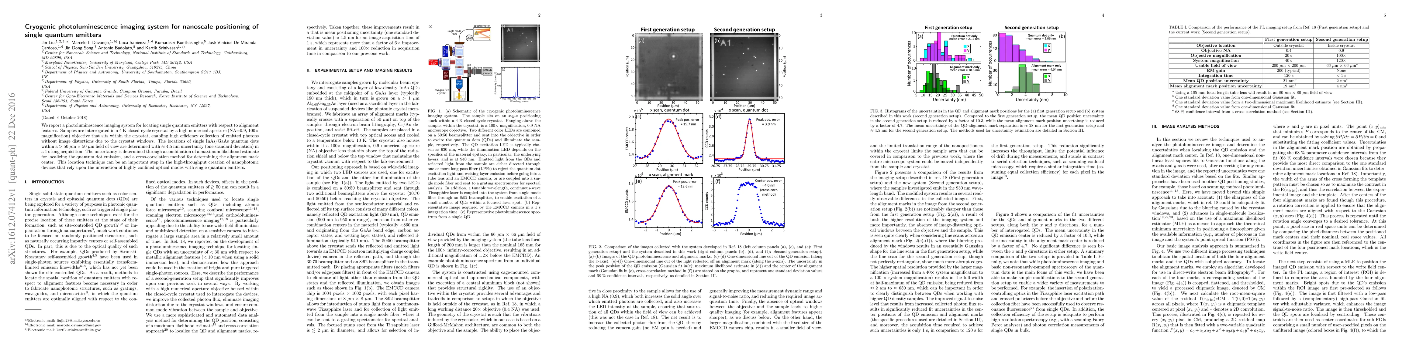 We report a photoluminescence imaging system for locating single quantum emitters with respect to alignment features. Samples are interrogated in a 4~K closed-cycle cryostat by a high numerical aperture (NA=0.9, 100$\times$ magnification) objective that sits within the cryostat, enabling high efficiency collection of emitted photons without image distortions due to the cryostat windows. The locations of single InAs/GaAs quantum dots within a $>50$~$\mu$m~$\times$~50~$\mu$m field of view are determined with $\approx4.5$~nm uncertainty (one standard deviation) in a 1~s long acquisition. The uncertainty is determined through a combination of a maximum likelihood estimate for localizing the quantum dot emission, and a cross-correlation method for determining the alignment mark center. This location technique can be an important step in the high-throughput creation of nanophotonic devices that rely upon the interaction of highly confined optical modes with single quantum emitters.