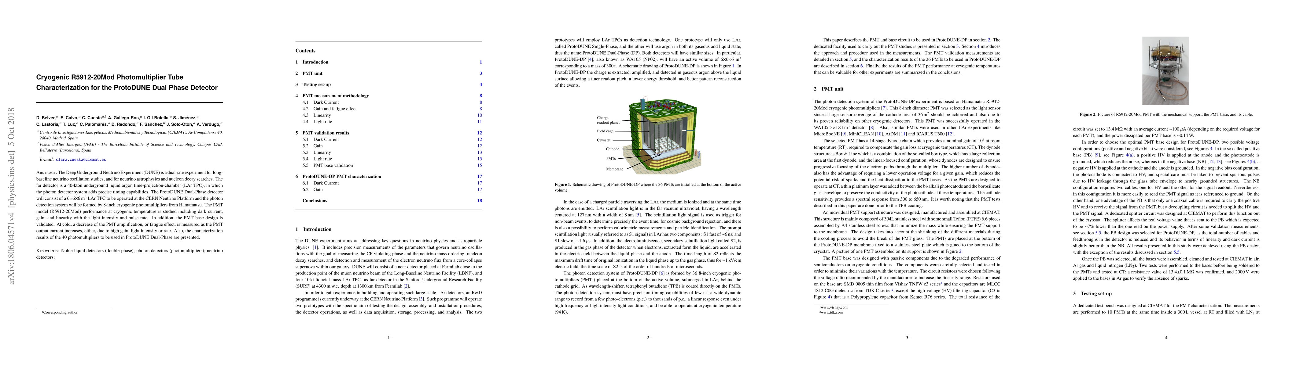 The Deep Underground Neutrino Experiment (DUNE) is a dual-site experiment for long baseline neutrino oscillation studies, and for neutrino astrophysics and nucleon decay searches. The far detector is a 40-kton underground liquid argon time-projection-chamber (LAr TPC), in which the photon detector system adds precise timing capabilities. The ProtoDUNE dual phase detector will consist of a 6x6x6 m^3 LAr TPC to be operated at the CERN Neutrino Platform and the photon detection system will be formed by 8-inch cryogenic photomultipliers from Hamamatsu. The PMT model (R5912-20Mod) performance at cryogenic temperature is studied including dark current, gain, and linearity with the light intensity and pulse rate. In addition, the PMT base design is validated. At cold, a decrease of the PMT amplification, or fatigue effect, is measured as the PMT output current increases, either, due to high gain, light intensity or rate. Also, the characterisation results of the 40 photomultipliers to be used in ProtoDUNE dual phase are presented.