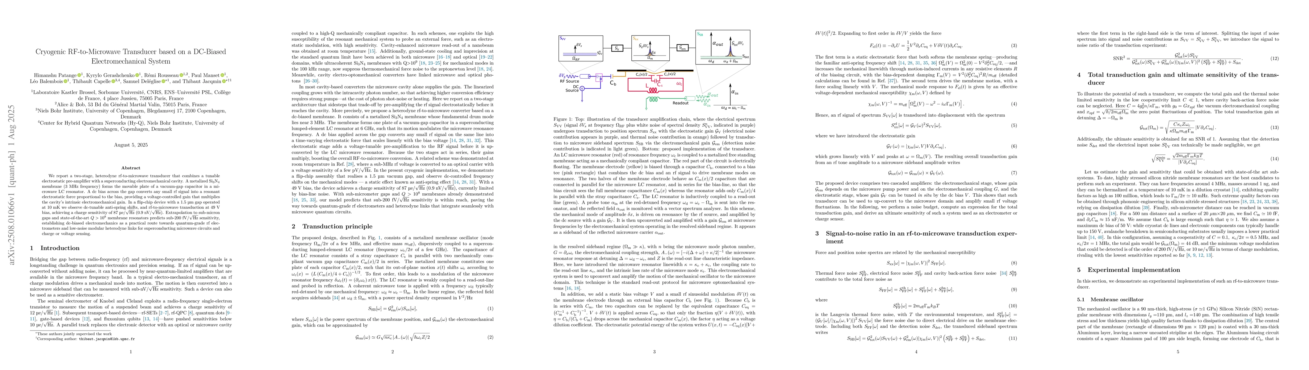 We report a two-stage, heterodyne rf-to-microwave transducer that combines a tunable electrostatic pre-amplifier with a superconducting electromechanical cavity. A metalized Si$_3$N$_4$ membrane (3 MHz frequency) forms the movable plate of a vacuum-gap capacitor in a microwave LC resonator. A dc bias across the gap converts any small rf signal into a resonant electrostatic force proportional to the bias, providing a voltage-controlled gain that multiplies the cavity's intrinsic electromechanical gain. In a flip-chip device with a 1.5 $\mathrm{\mu}$m gap operated at 10 mK we observe dc-tunable anti-spring shifts, and rf-to-microwave transduction at 49 V bias, achieving a charge sensitivity of 87 $\mathrm{\mu}$e/$\sqrt{\mathrm{Hz}}$ (0.9 nV/$\sqrt{\mathrm{Hz}}$). Extrapolation to sub-micron gaps and state-of-the-art $Q>10^8$ membrane resonators predicts sub-200 fV/$\sqrt{\mathrm{Hz}}$ sensitivity, establishing dc-biased electromechanics as a practical route towards quantum-grade rf electrometers and low-noise modular heterodyne links for superconducting microwave circuits and charge or voltage sensing.