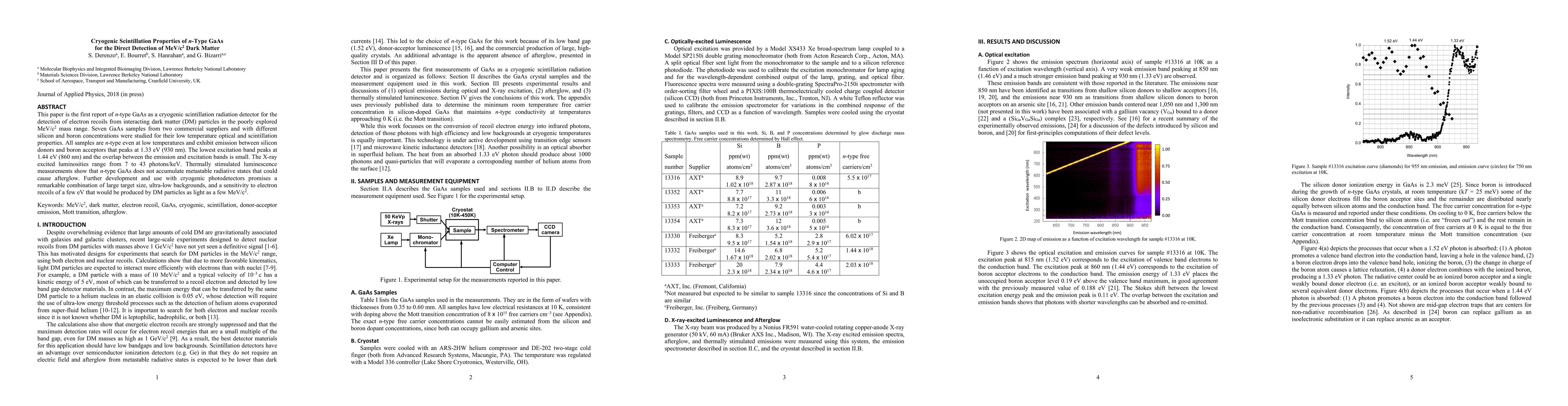 This paper is the first report of n-type GaAs as a cryogenic scintillation radiation detector for the detection of electron recoils from interacting dark matter (DM) particles in the poorly explored MeV/c2 mass range. Seven GaAs samples from two commercial suppliers and with different silicon and boron concentrations were studied for their low temperature optical and scintillation properties. All samples are n-type even at low temperatures and exhibit emission between silicon donors and boron acceptors that peaks at 1.33 eV (930 nm). The lowest excitation band peaks at 1.44 eV (860 nm) and the overlap between the emission and excitation bands is small. The X-ray excited luminosities range from 7 to 43 photons/keV. Thermally stimulated luminescence measurements show that n-type GaAs does not accumulate metastable radiative states that could cause afterglow. Further development and use with cryogenic photodetectors promises a remarkable combination of large target size, ultra-low backgrounds, and a sensitivity to electron recoils of a few eV that would be produced by DM particles as light as a few MeV/c2.
