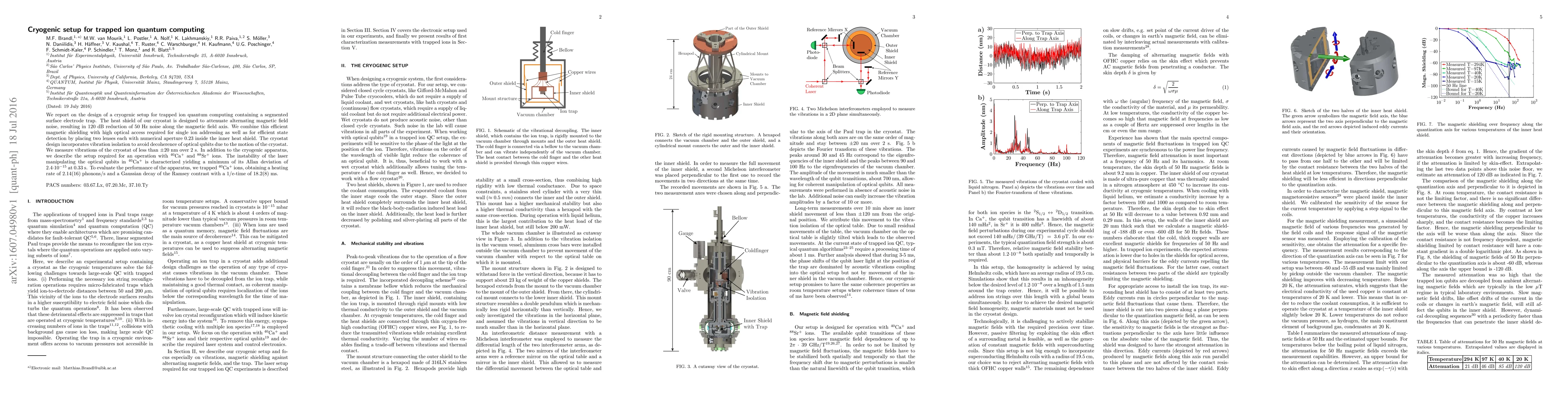 This paper details the cryogenic setup for trapped ion quantum computing featuring a segmented surface electrode trap, achieving a 120~dB reduction in 50~Hz magnetic field noise and minimal vibrations of less than $\pm$20~nm over 2~s. The apparatus supports efficient ion addressing and state detection, and demonstrates stable operation with $^{\mathrm{40}}$Ca$^{\mathrm{+}}$ and $^{\mathrm{88}}$Sr$^{\mathrm{+}}$ ions.