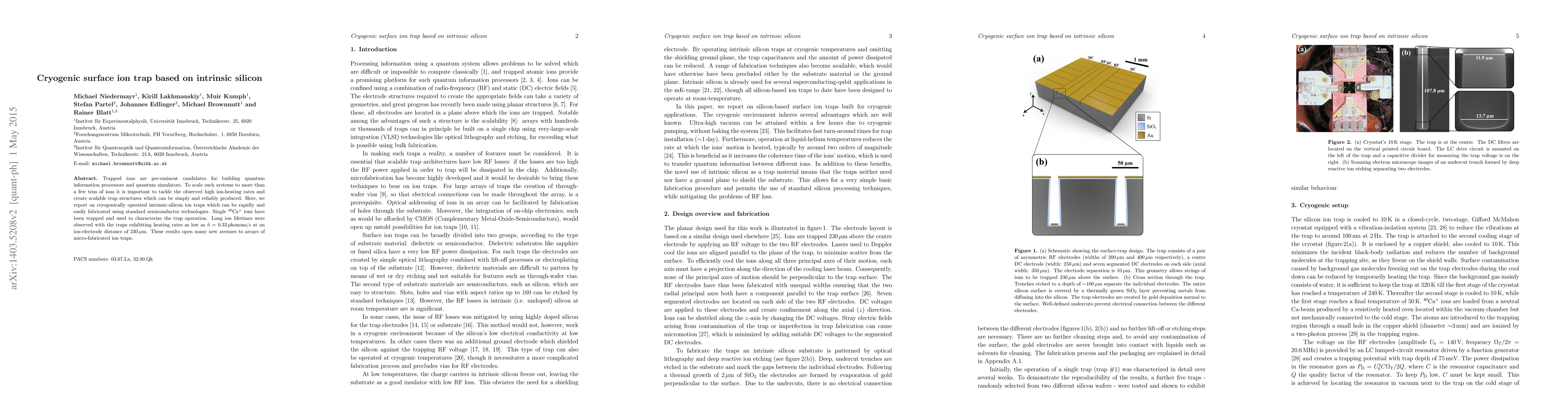 This paper reports on cryogenic silicon surface ion traps fabricated using standard semiconductor techniques, demonstrating low ion-heating rates and long ion lifetimes, which are crucial for scalable trapped-ion quantum computing. The study uses single $^{40}$Ca$^+$ ions to characterize the trap, achieving heating rates as low as 0.33 phonons/s.