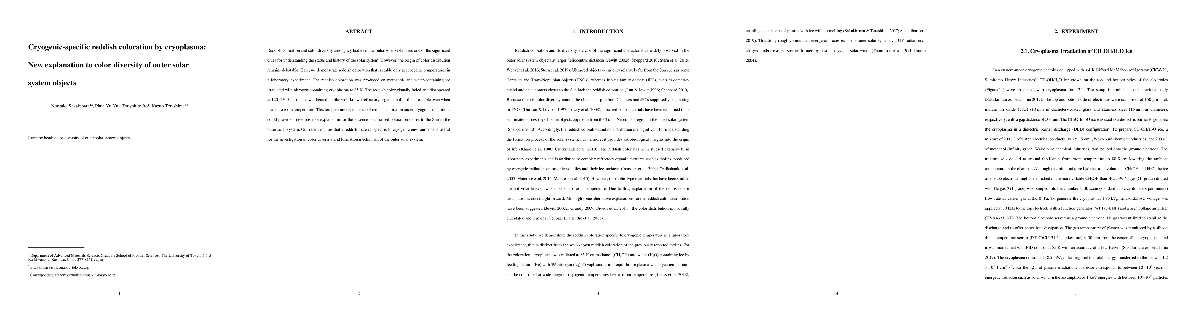 Reddish coloration and color diversity among icy bodies in the outer solar system are one of the significant clues for understanding the status and history of the solar system. However, the origin of color distribution remains debatable. Here, we demonstrate reddish coloration that is stable only at cryogenic temperatures in a laboratory experiment. The reddish coloration was produced on methanol- and water-containing ice irradiated with nitrogen-containing cryoplasma at 85 K. The reddish color visually faded and disappeared at 120-150 K as the ice was heated, unlike well-known refractory organic tholins that are stable even when heated to room temperature. This temperature dependence of reddish coloration under cryogenic conditions could provide a new possible explanation for the absence of ultra-red coloration closer to the Sun in the outer solar system. Our result implies that a reddish material specific to cryogenic environments is useful for the investigation of color diversity and formation mechanism of the outer solar system.