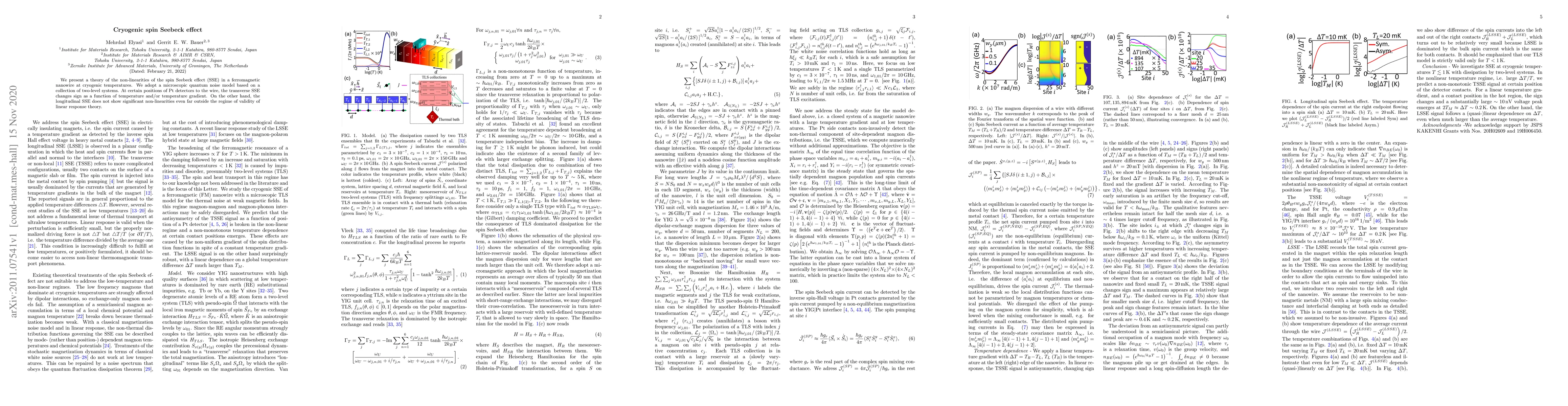 This paper theorizes the non-linear behavior of the spin Seebeck effect in ferromagnetic nanowires at cryogenic temperatures, using a quantum noise model of two-level systems. It finds that the transverse SSE changes sign with temperature/gradient, while the longitudinal SSE remains linear even outside typical linear response theory limits.