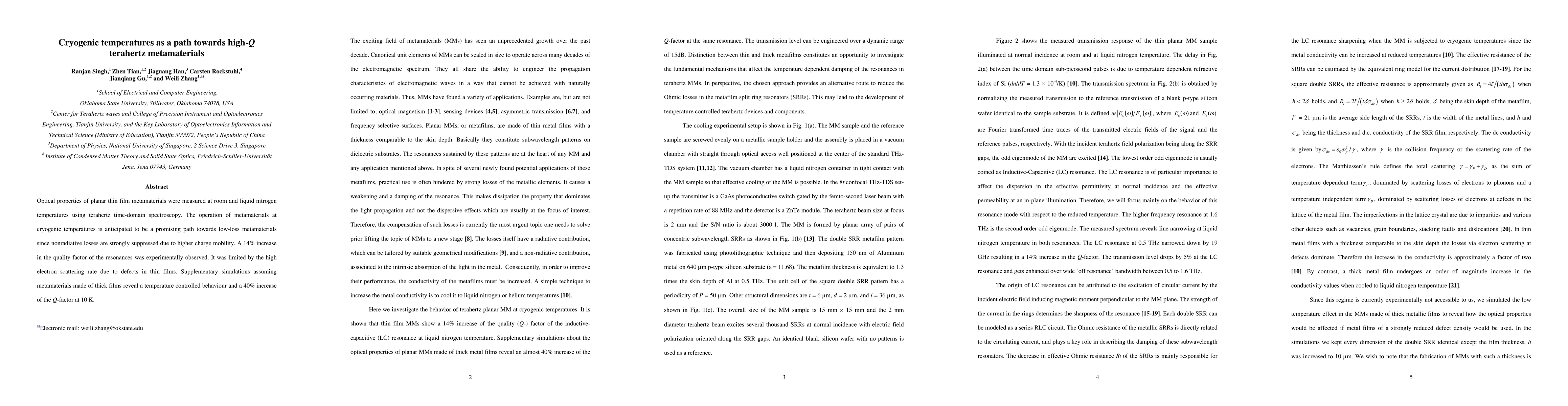 This paper investigates the optical properties of planar thin film metamaterials at cryogenic temperatures, finding a 14% increase in the quality factor due to suppressed nonradiative losses. Simulations suggest a potential 40% increase in Q-factor at 10 K if defects are minimized.