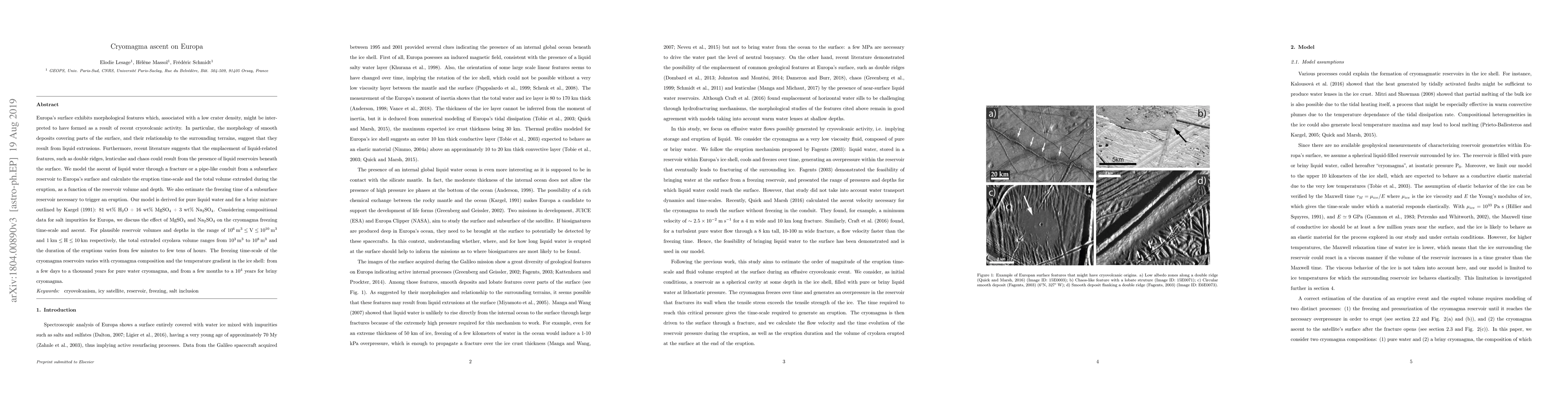 The study models the ascent of liquid water through a fracture or pipe-like conduit from a subsurface reservoir to Europa's surface, calculating eruption time-scale and total volume extruded as a function of reservoir volume and depth. It also estimates the freezing time of a subsurface reservoir necessary to trigger an eruption, considering pure liquid water and a briny mixture.