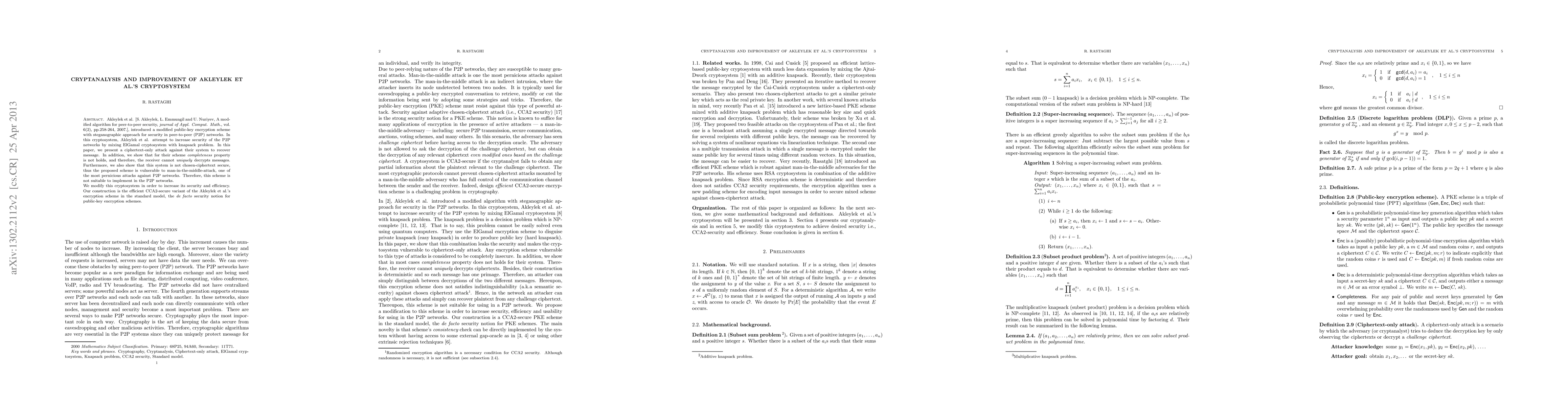 Akleylek et al. [S. Akleylek, L. Emmungil and U. Nuriyev, A mod ified algorithm for peer-to-peer security, journal of Appl. Comput. Math., vol. 6(2), pp.258-264, 2007.], introduced a modified public-key encryption scheme with steganographic approach for security in peer-to-peer (P2P) networks. In this cryptosystem, Akleylek et al. attempt to increase security of the P2P networks by mixing ElGamal cryptosystem with knapsack problem. In this paper, we present a ciphertext-only attack against their system to recover message. In addition, we show that for their scheme completeness property is not holds, and therefore, the receiver cannot uniquely decrypts messages. Furthermore, we also show that this system is not chosen-ciphertext secure, thus the proposed scheme is vulnerable to man-in-the-middle-attack, one of the most pernicious attacks against P2P networks. Therefore, this scheme is not suitable to implement in the P2P networks. We modify this cryptosystem in order to increase its security and efficiency. Our construction is the efficient CCA2-secure variant of the Akleylek et al.'s encryption scheme in the standard model, the de facto security notion for public-key encryption schemes.