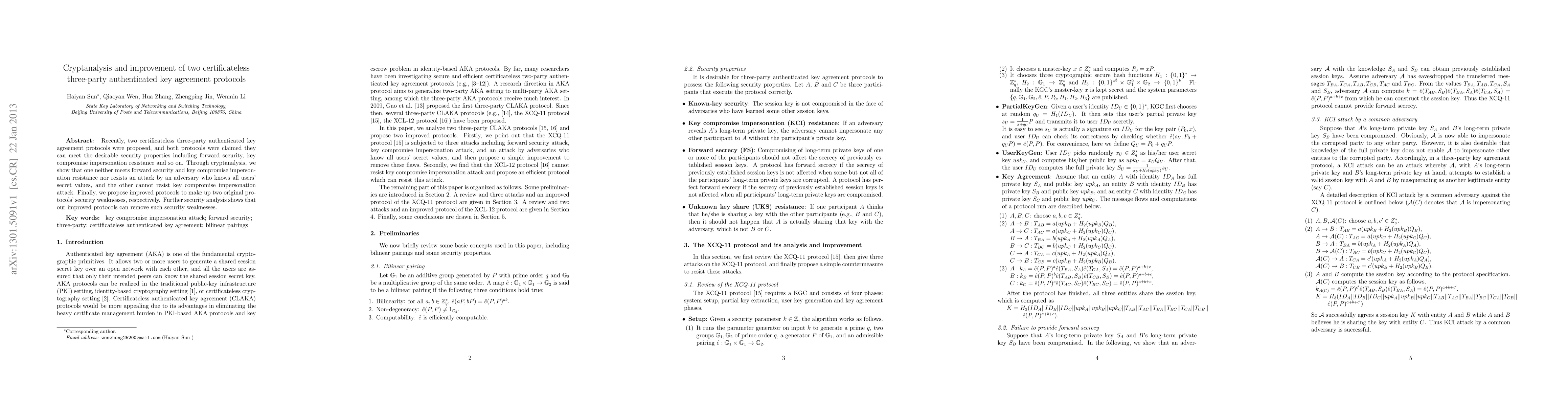 This paper identifies and analyzes security flaws in two proposed certificateless three-party authenticated key agreement protocols, revealing that one lacks forward security and key compromise impersonation resistance, while the other cannot resist key compromise impersonation. The authors then propose improved protocols to address these weaknesses, demonstrating through further analysis that their enhancements effectively resolve the identified security issues.