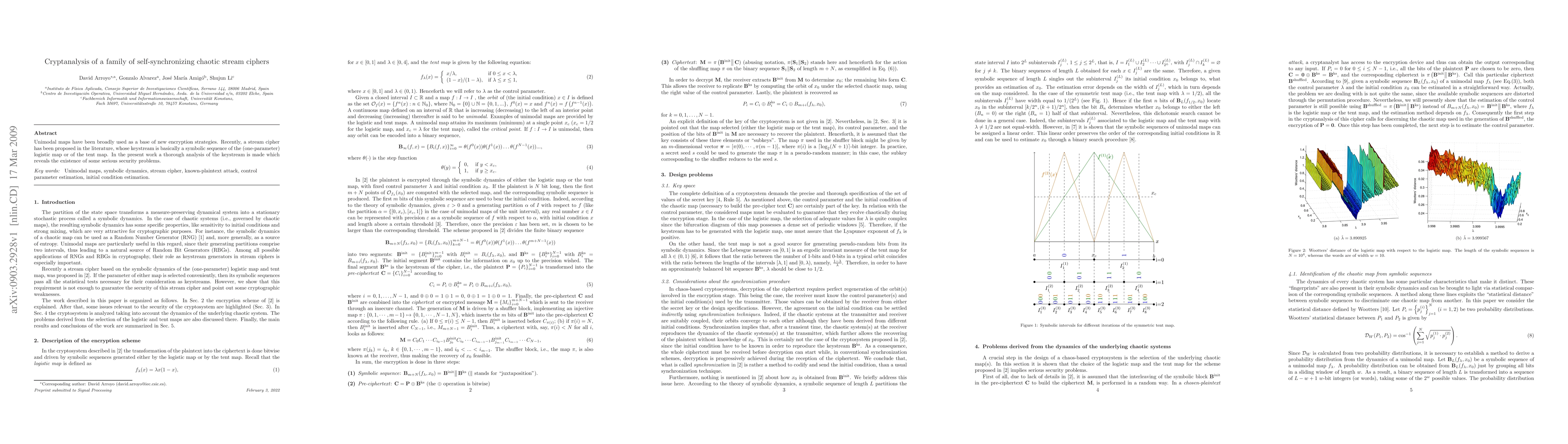 Researchers analyzed a self-synchronizing chaotic stream cipher and found serious security problems with its keystream, which is based on unimodal maps like the logistic map or tent map.