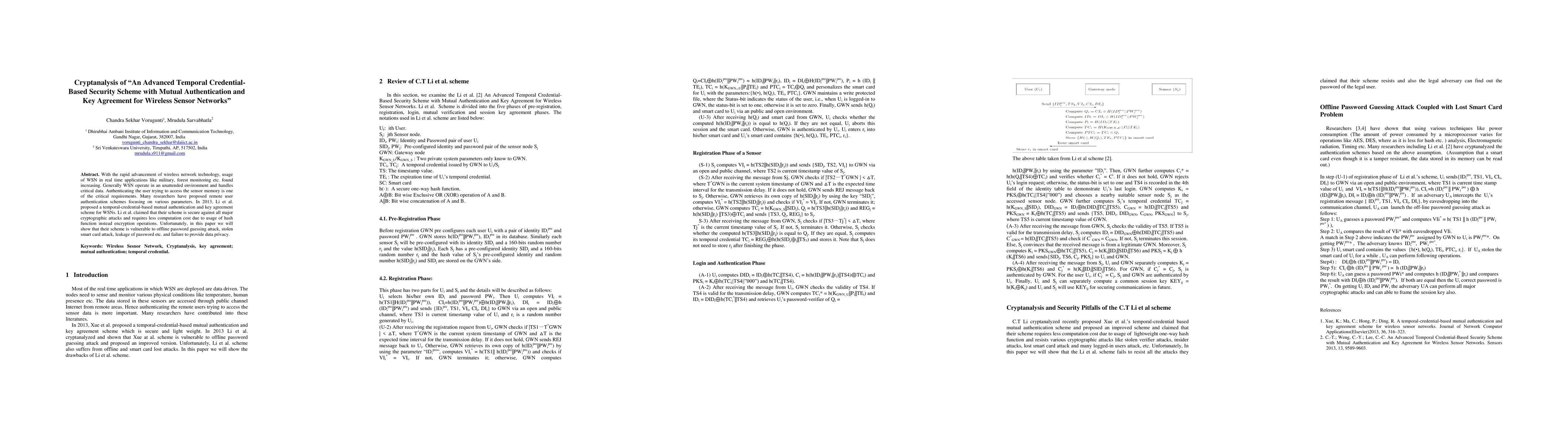 With the rapid advancement of wireless network technology, usage of WSN in real time applications like military, forest monitoring etc. found increasing. Generally WSN operate in an unattended environment and handles critical data. Authenticating the user trying to access the sensor memory is one of the critical requirements. Many researchers have proposed remote user authentication schemes focusing on various parameters. In 2013, Li et al. proposed a temporal-credential-based mutual authentication and key agreement scheme for WSNs. Li et al. claimed that their scheme is secure against all major cryptographic attacks and requires less computation cost due to usage of hash function instead encryption operations. Unfortunately, in this paper we will show that their scheme is vulnerable to offline password guessing attack, stolen smart card attack, leakage of password etc. and failure to provide data privacy.