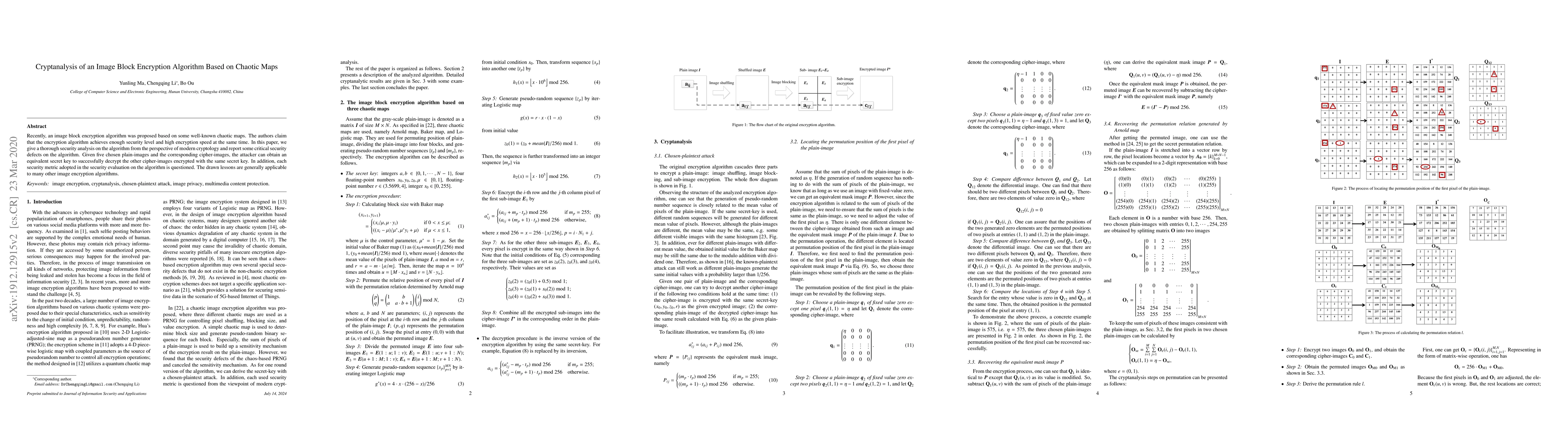 This paper conducts a comprehensive security analysis of an image block encryption algorithm based on chaotic maps, revealing critical vulnerabilities. The authors demonstrate that with five chosen plain-images and their corresponding cipher-images, an attacker can derive the secret key to decrypt other encrypted images, undermining the algorithm's security claims.