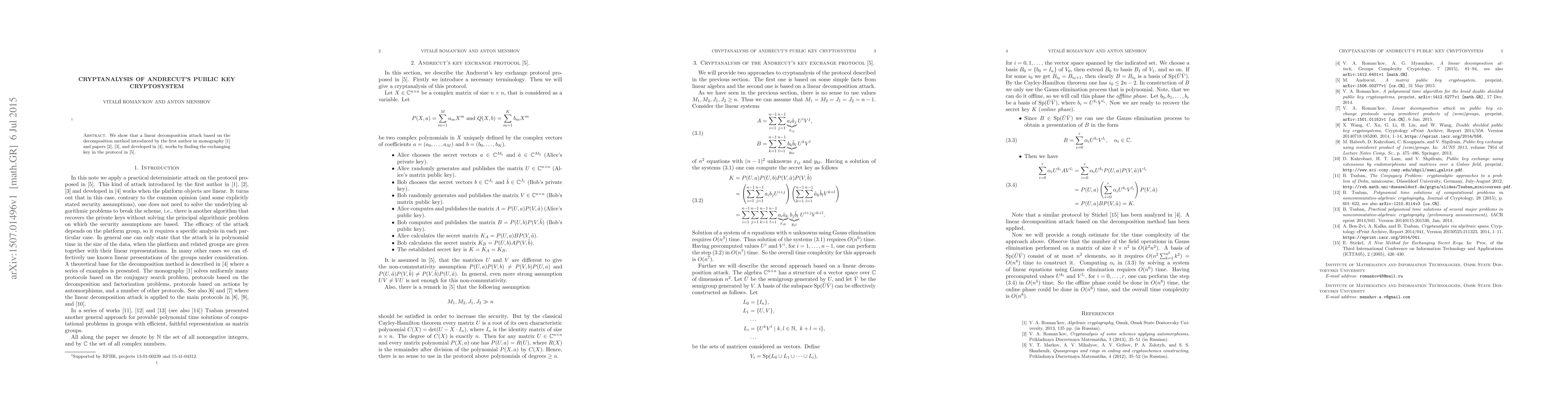 We show that a linear decomposition attack based on the decomposition method introduced by the first author in monography "Algebraic cryptography" and in a series of papers works by finding the exchanging key in the Abdrecut's protocol.