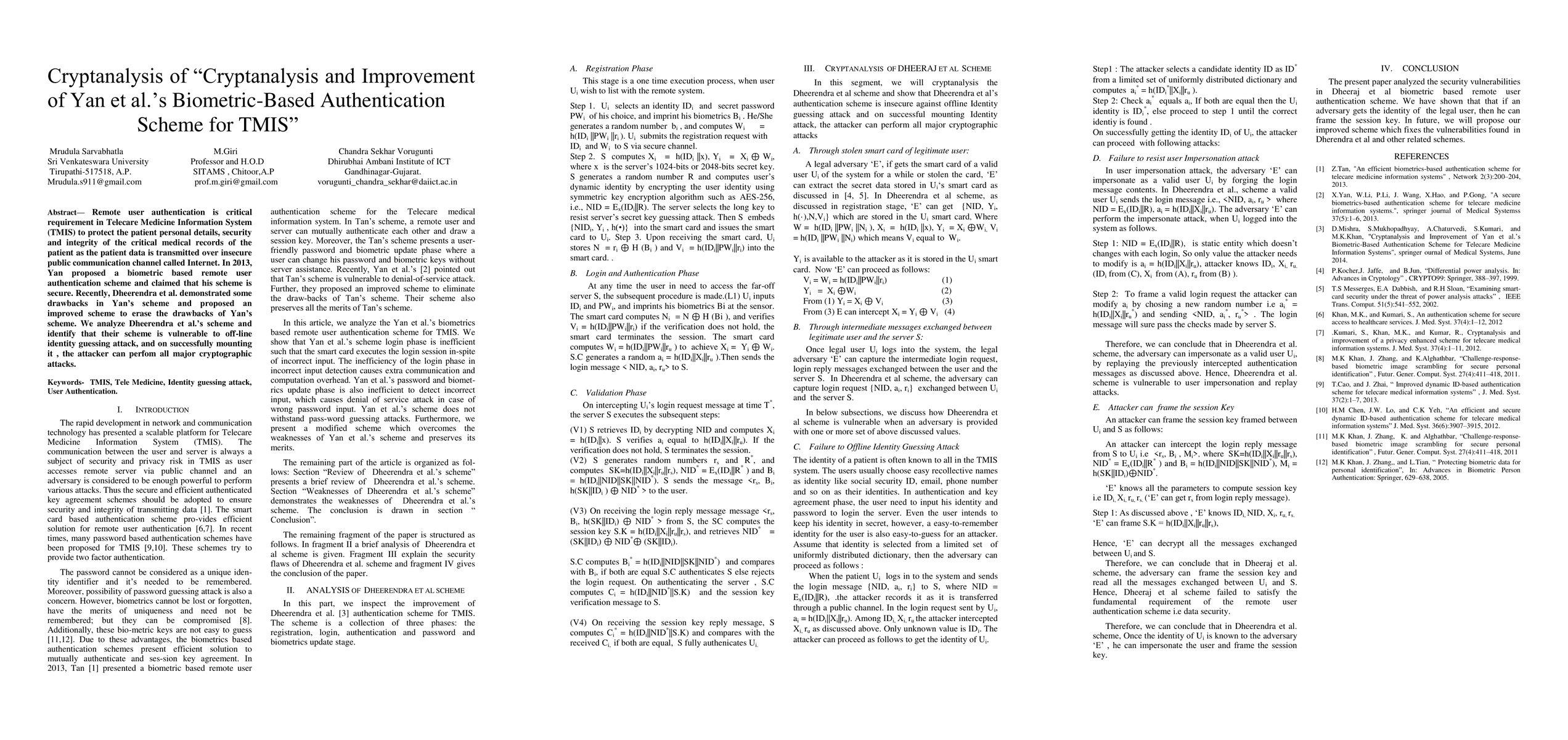 This paper analyzes and critiques an improved biometric-based remote user authentication scheme proposed by Dheerendra et al. to address vulnerabilities in Yan et al.'s earlier scheme, revealing that Dheerendra et al.'s scheme is still susceptible to off-line identity guessing attacks, undermining its security claims.