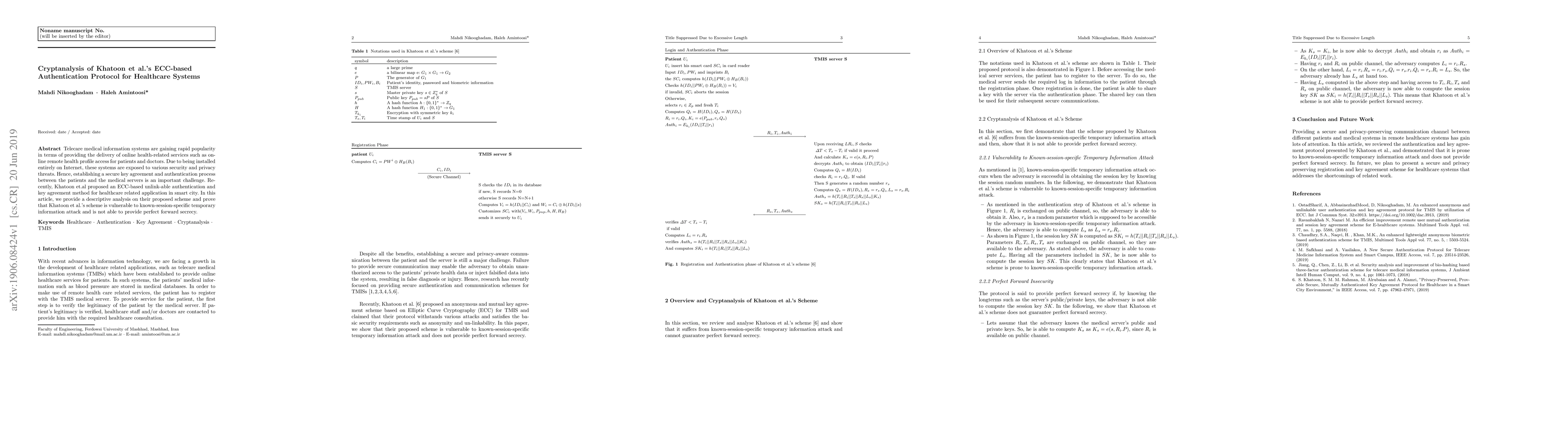 This paper analyzes Khatoon et al.'s ECC-based authentication protocol for healthcare systems, revealing vulnerabilities to known-session-specific temporary information attacks and a lack of perfect forward secrecy. The study highlights the protocol's failure to secure key agreements adequately in telecare medical information systems.